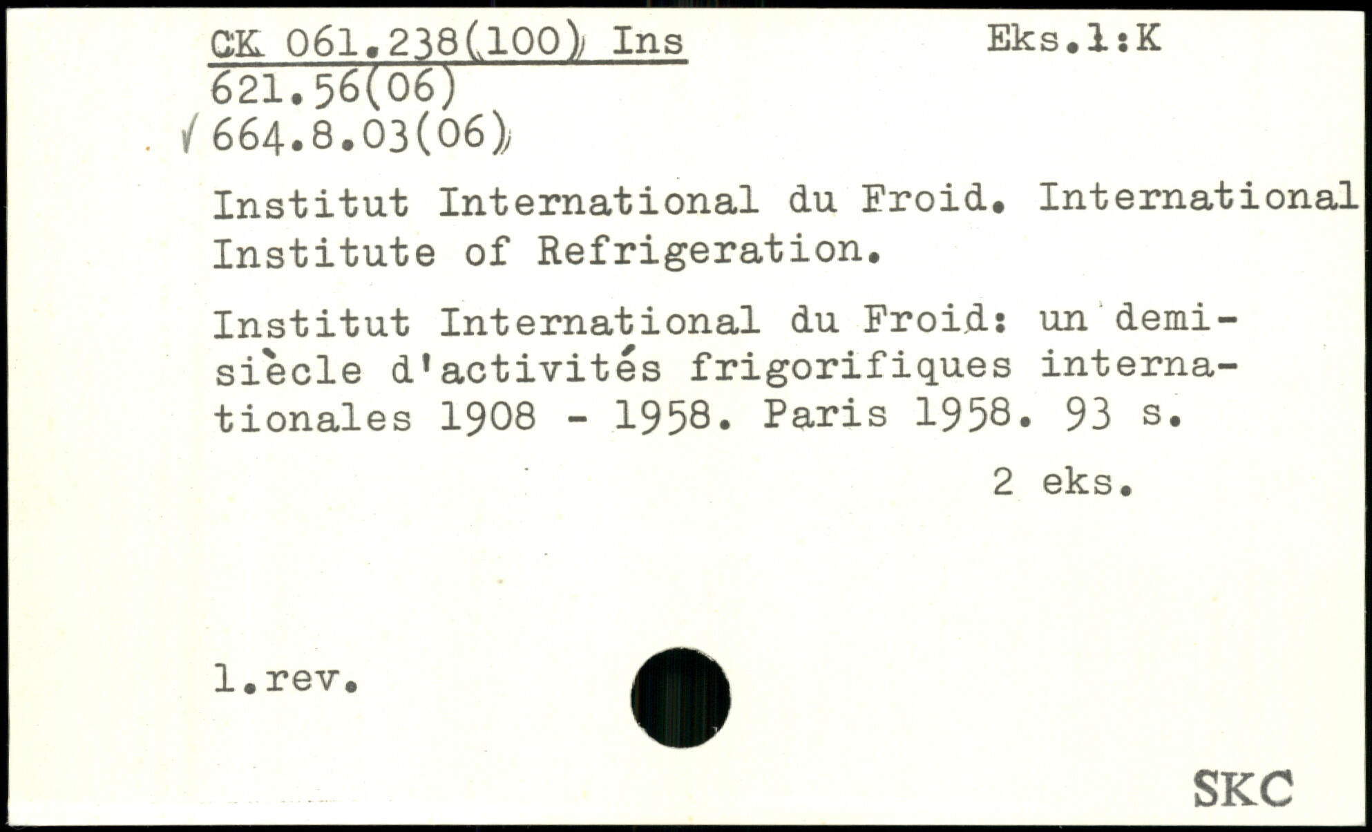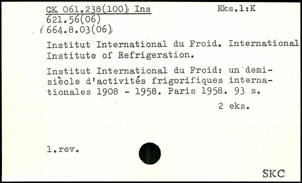 Institut International du Froid. International Institute of Refrigeration. Institut International du Froid: un demi-siede d’activités frigorifiques internationales 1908 - 1958.