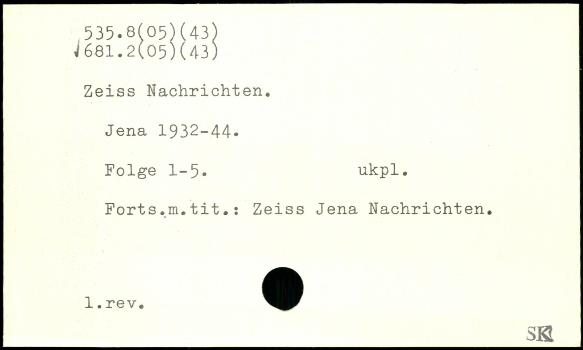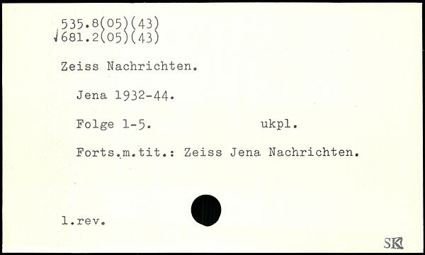 Zeiss Nachrichten. Jena 1932-44. Folge 1-5. ukpl. Forts.m.tit.: Zeiss Jena Nachrichten.