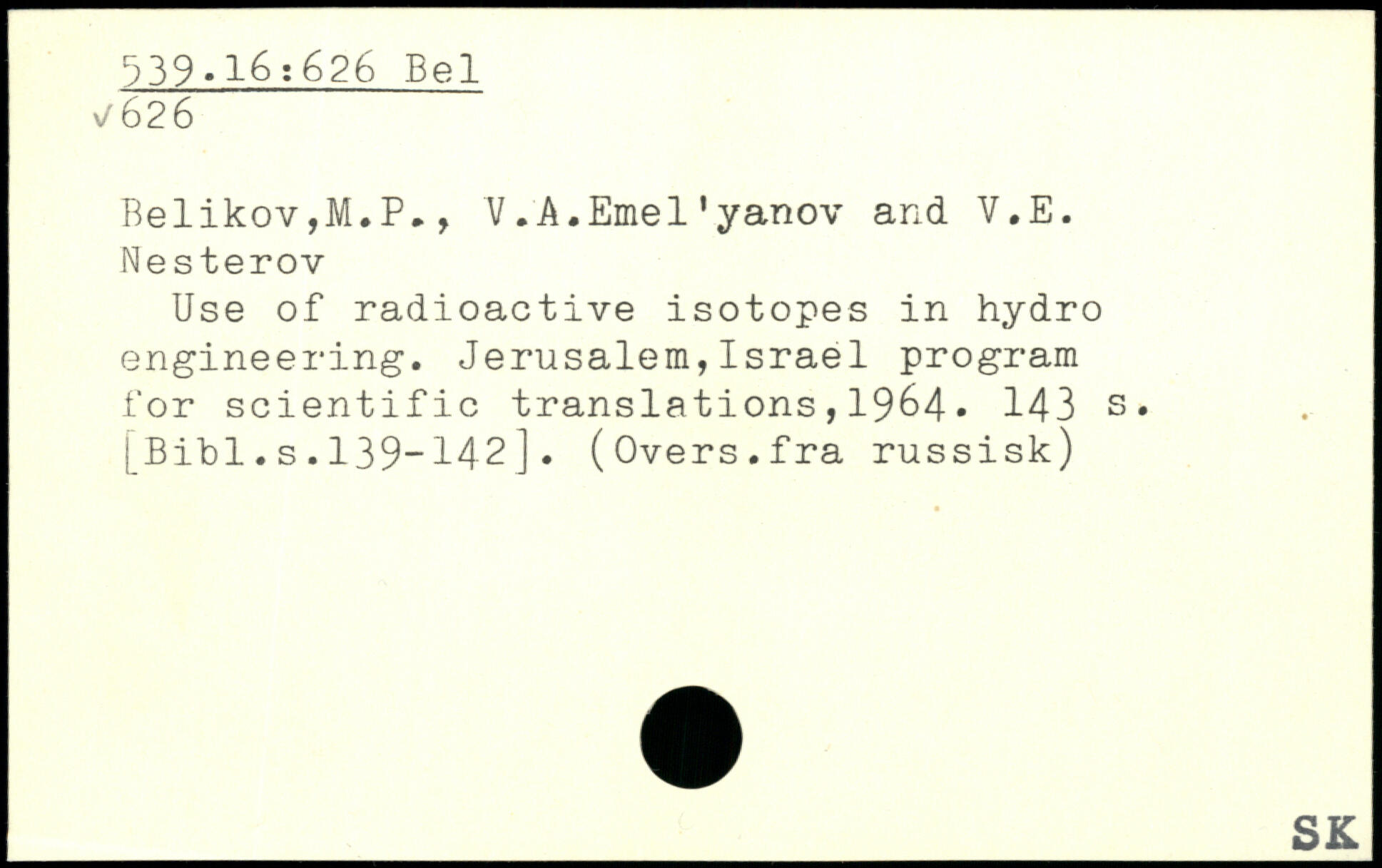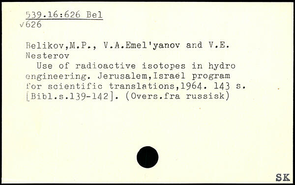 BelikovjM.P., V.A.Emel’yanov and V.E. Nesterov Use of radioactive isotopes in hydro engineering. Jerusalem,Israel program for scientific translations,1964.