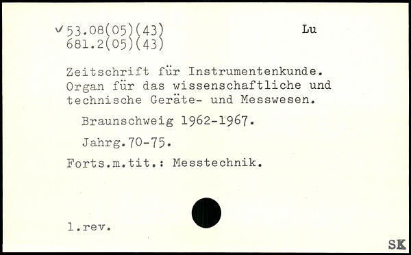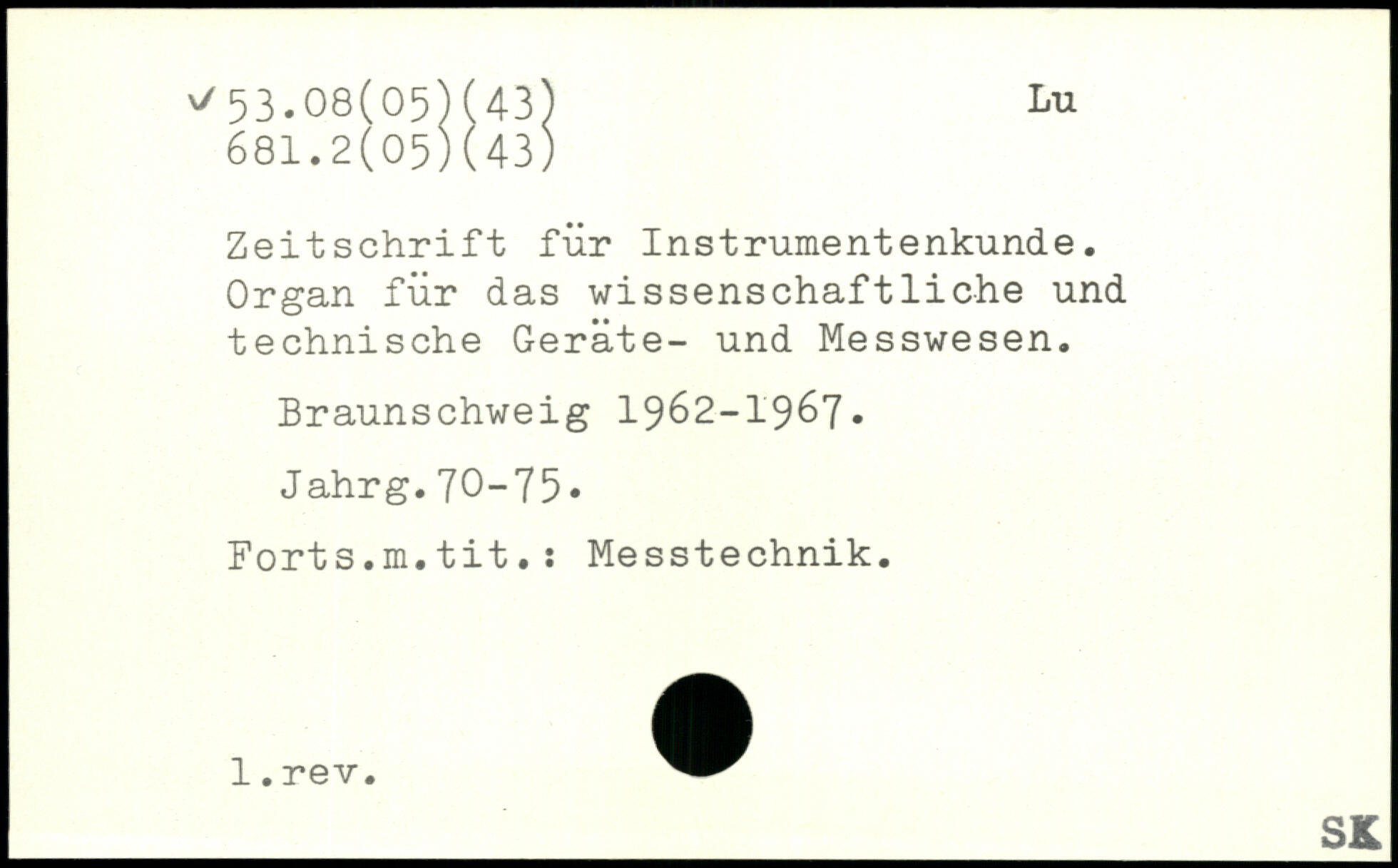 Zeitschrift für Instrumentenkunde. Organ für das wissenschaftliche und technische Geräte- und Messwesen. Braunschweig 1962-1967. Jahrg.70-75, Forts.m.tit.: Messtechnik.