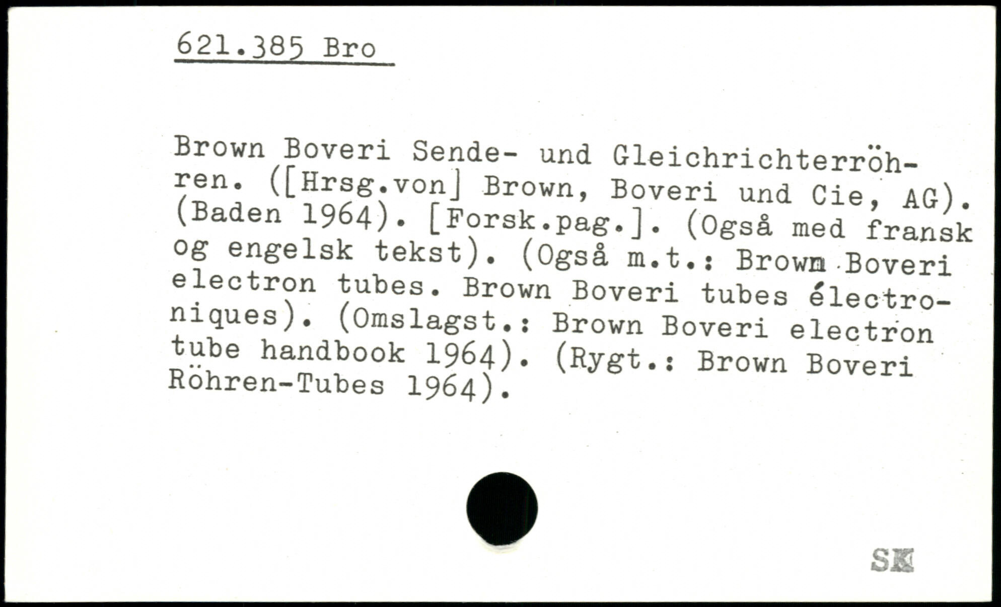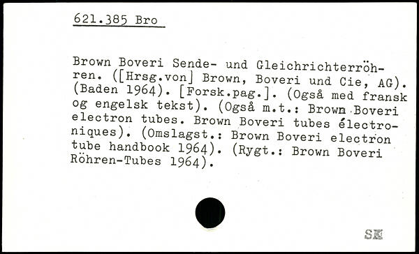 Brown Boveri Sende- und Gleichrichterroh-ren. ([Hrsg.vonJ Brown, Boveri und Cie, AG). (Baden 1964). [Forsk.pag.]. (Også med fransk og engelsk tekst). (Også m.t.: Brown .Boveri électron tubes. Brown Boveri tubes électroniques). (Omslagst.: Brown Boveri electron tube handbook 1964). (Rygt.; Brown Boveri Rohren-Tubes 1964).