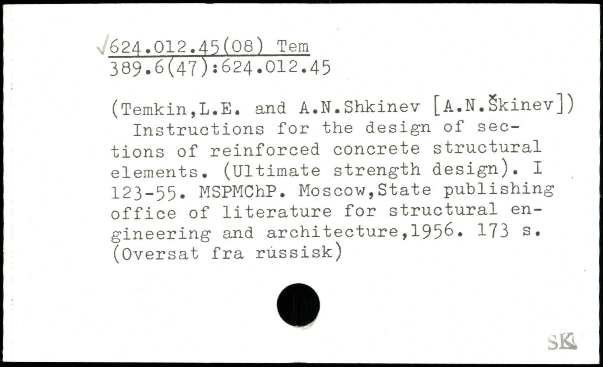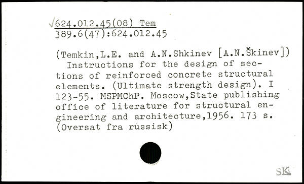 (Temkin,L.E. and A.N.Shkinev [A.N.Skinev]) Instructions for the design of sections of reinforced concrete structural elements. (Ultimate strength design). I 123-55. MSPMChP. Moscow,State publishing office of literature for structural engineering and architecture,1956.