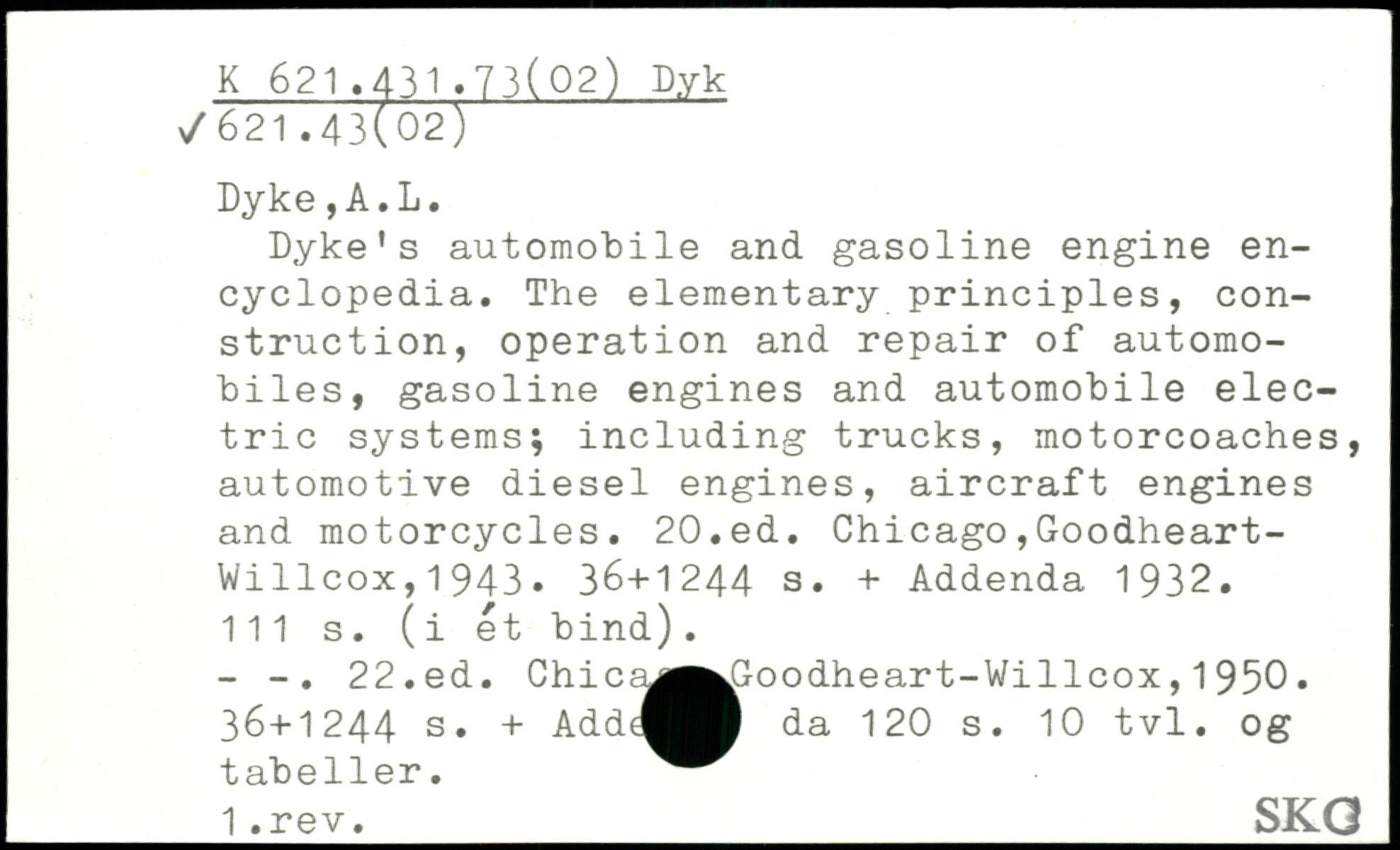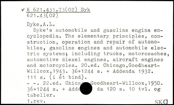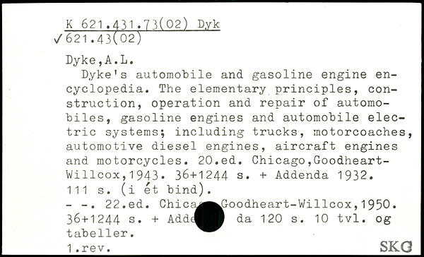 Dyke's automobile and gasoline engine encyclopedia. The elementary principles, construction, operation and repair of automobiles, gasoline engines and automobile electric systems., including trucks, motorcoaches, automotive diesel engines, aircraft engines and motorcycles.