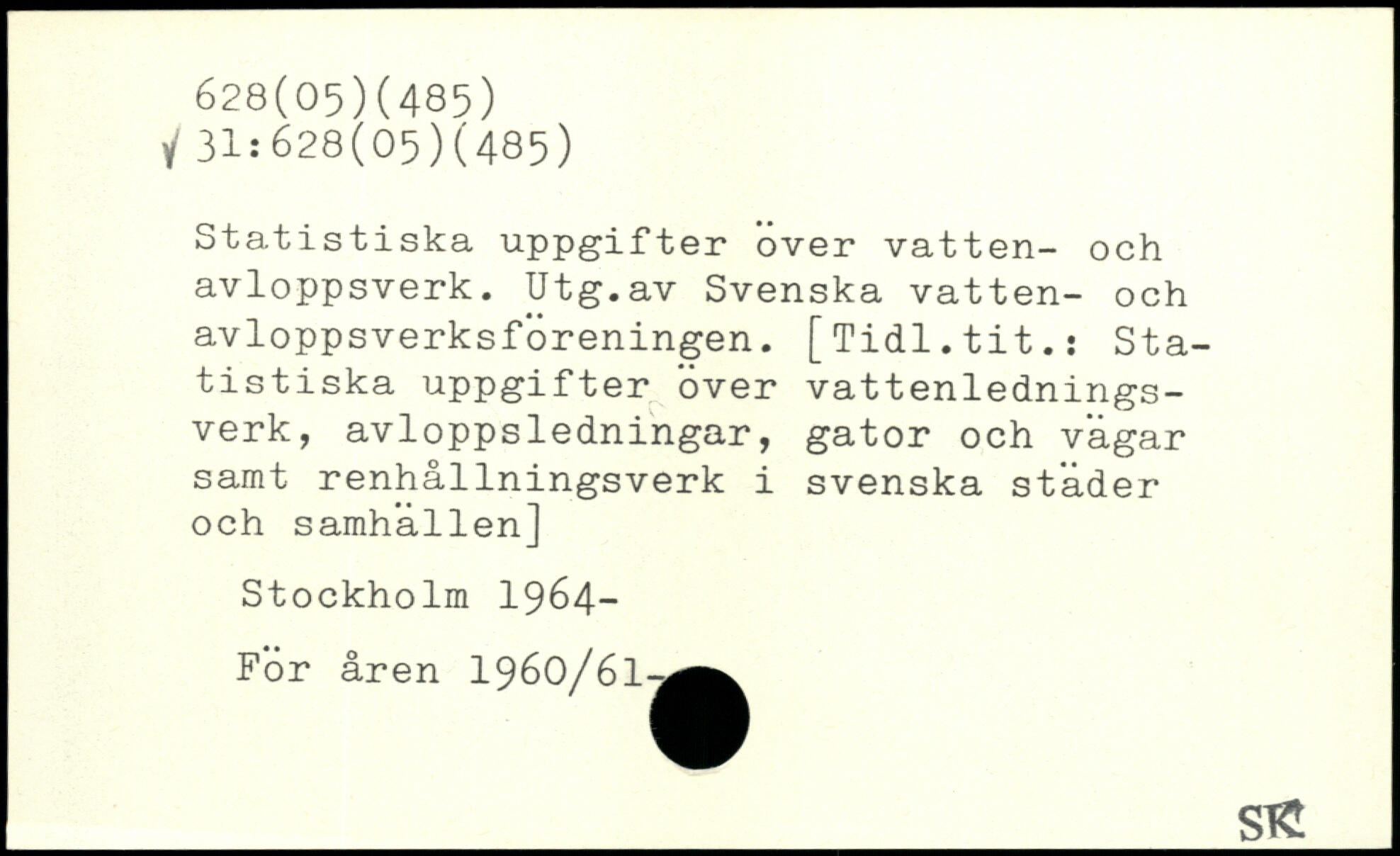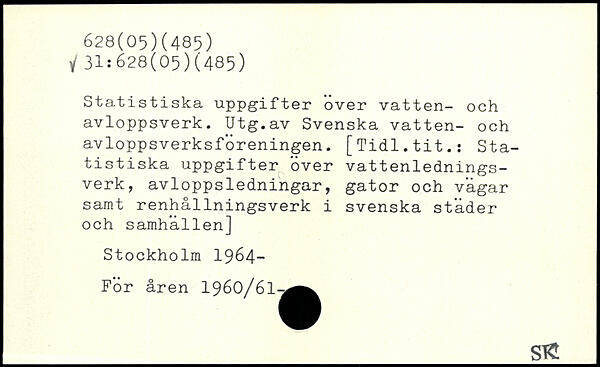 Statistiska uppgifter over vatten- och avloppsverk. Utg.av Svenska vatten- och avloppsverksforeningen. [Tidl.tit.: Statistiska uppgifter över vattenledningsverk, avloppsledningar, gator och vägar samt renhållningsverk i svenska städer och samhallen]