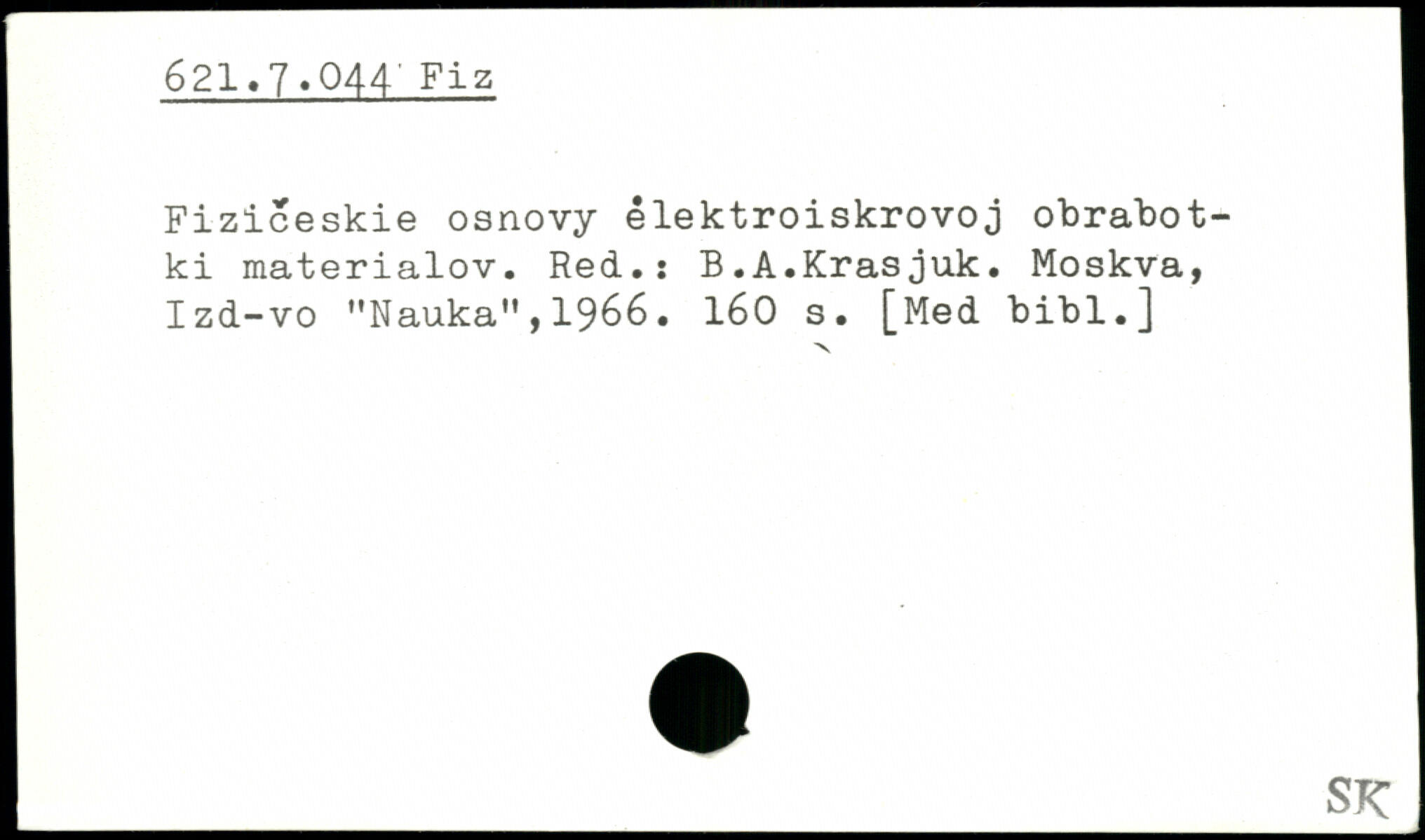 Fiziceskie osnovy êlektroiskrovoj obrabot- | ki materialov. Red.! B.A.Krasjuk. Moskva, j Izd-vo "Nauka”,1966. I6O s. [Med bibl.]