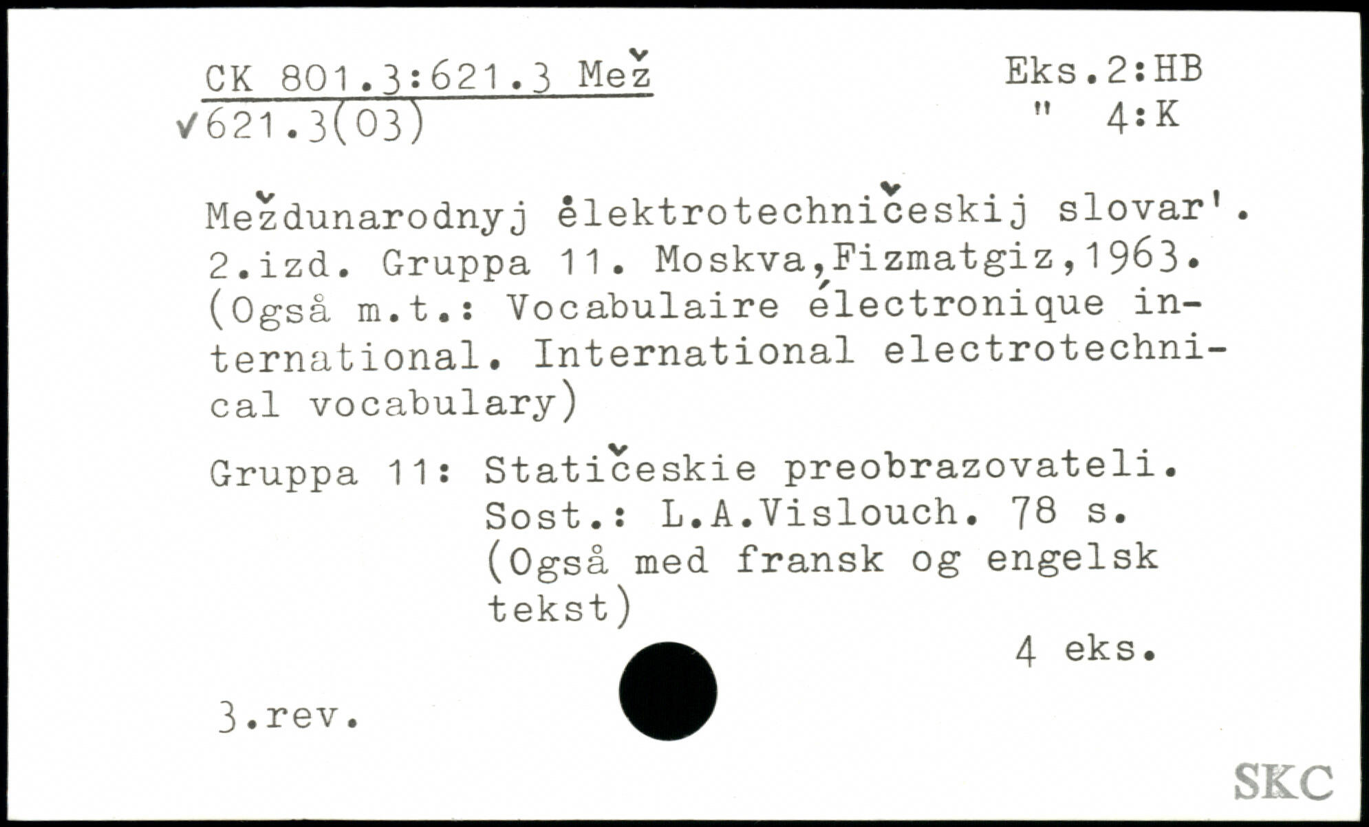 Mezdunarodnyj êlektrotechniceskij slovar’. 2.izd. Gruppa 11. Moskva,,Fizmatgiz,1963. (Ogsâ m.t.ï Vocabulaire électronique international. International electrotechnical vocabulary) Gruppa 11: Staticeskie preobrazovateli. Sost.: L.A.Vislouch.