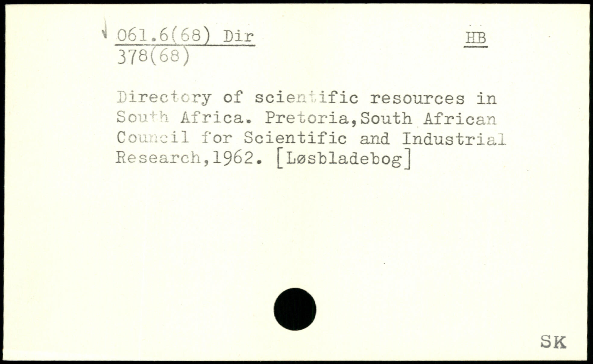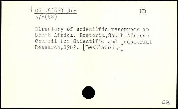 Directory of scientific resources in South Africa. Pretoria,South African Council for Scientific and Industrial Research,1962. [hcshladehog]