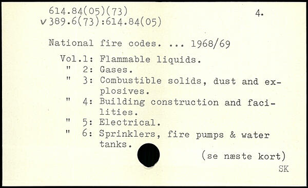 National fire codes. ... 1968/69 Vol.l: Flammable liquids. " 2: Gases. " 3î Combustible solids, dust and explosives. " 4: Building construction and faci lities. " 5: Electrical. " 6: Sprinklers, fire pumps & water tanks.