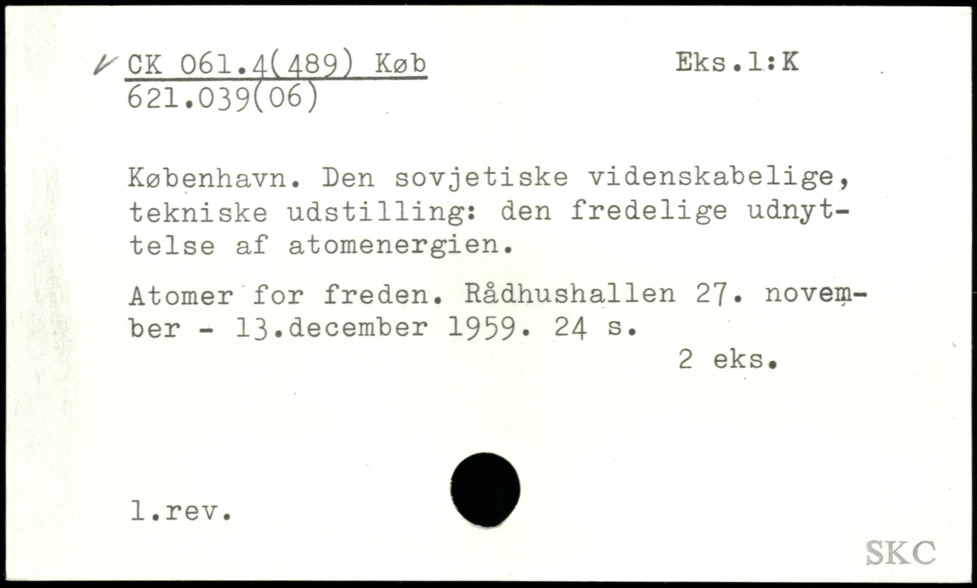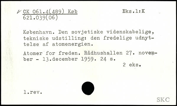 København. Den sovjetiske videnskabelige, tekniske udst1111ng: den fredelige udnyttelse af atomenergien. Atomer for freden. Rådhushallen 27, november - 13.december 1959.