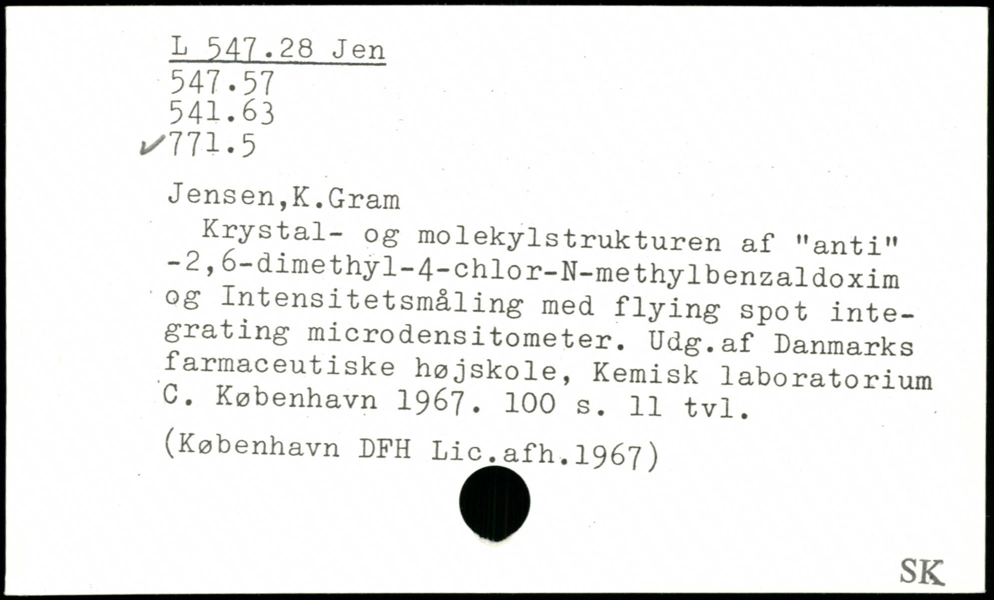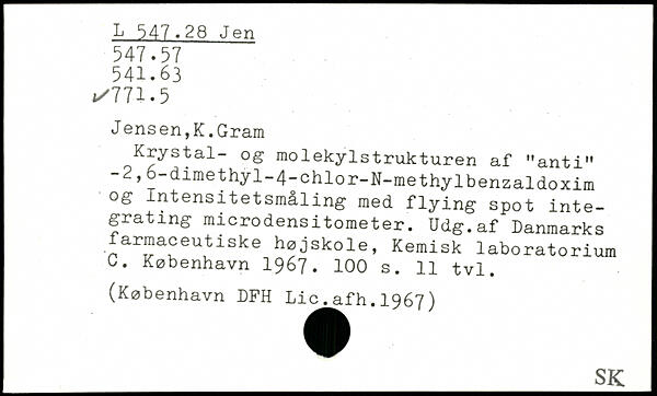 Jensen,K.Gram Krystal- og molekylstrukturen af "anti" -2,6-dimethyl-4-chlor-N-methylbenzaldoxim og Intensitetsmåling med flying spot integrating microdensitometer. Udg.af Danmarks farmaceutiske højskole, Kemisk laboratorium c.