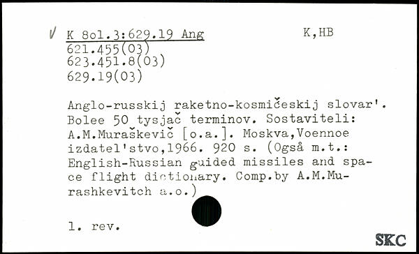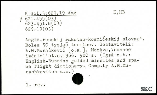 Anglo-russkij raketno-kosmideskij slovar’. Bolee 50 tysjac terminov. Sostaviteli: A.M.Muraskevie [o.a.]. Moskva,Voennoe izdatel’stvo,1966.