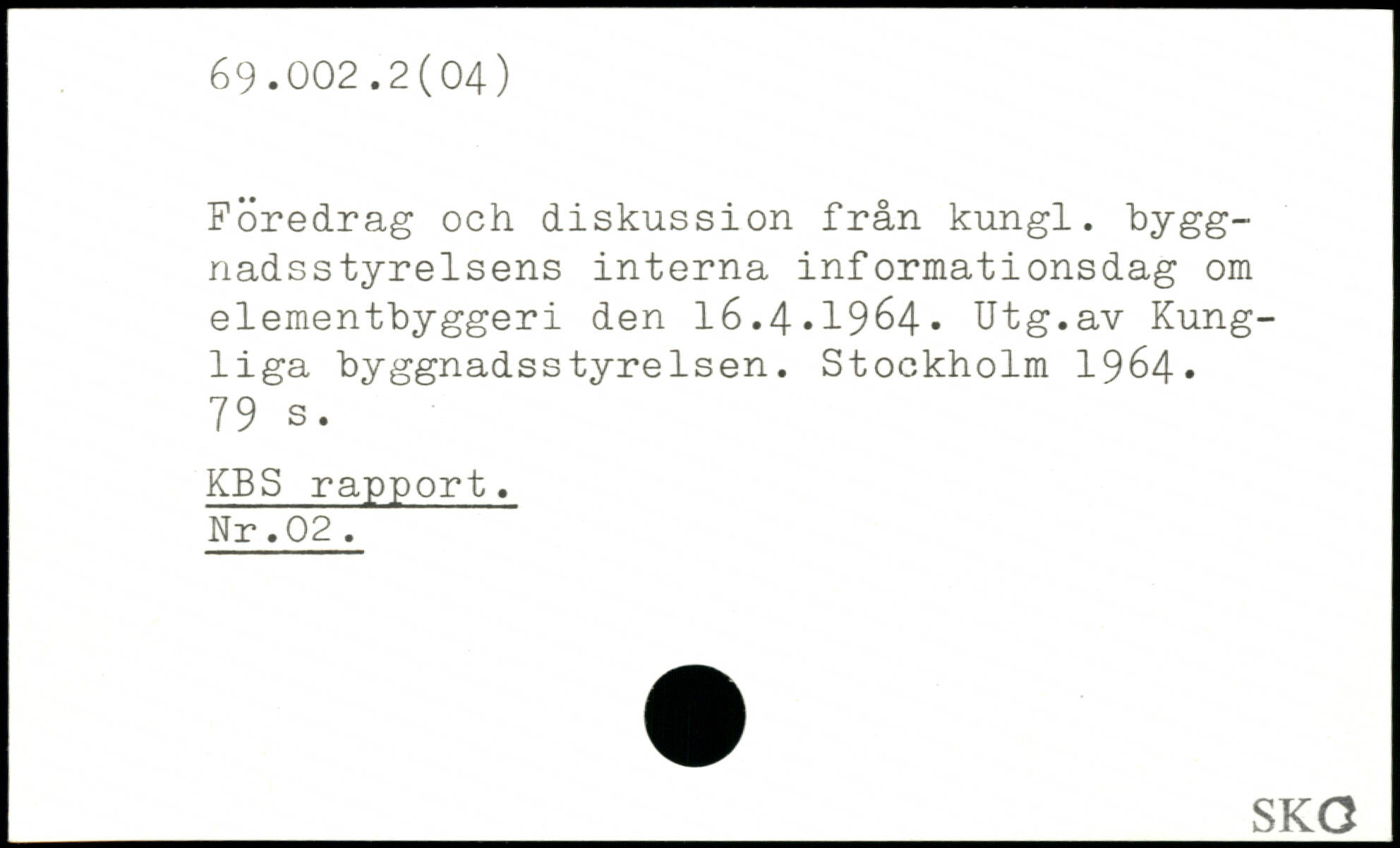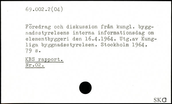 Föredrag och diskussion från kungl. bygg-nadsstyrelsens interna informationsdag om elementbyggeri den 16.4.1964. Utg.av Kungliga byggnadsstyrelsen.