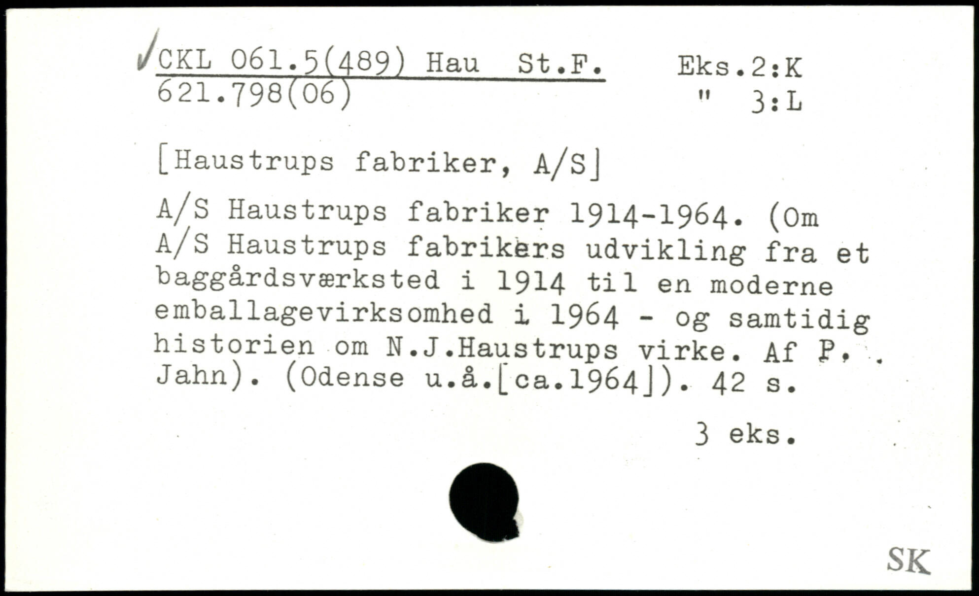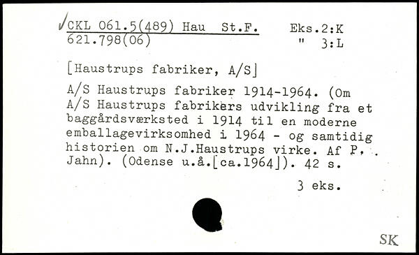 [Haustrups fabriker, A/Sj A/S Haustrups fabriker 1914-1964. (Om A/S Haustrups fabrikers udvikling fra et baggårdsværksted i 1914 til en moderne emballagevirksomhed i 1964 - og samtidig historien om N.J.Haustrups virke. Af P. Jahn). (Odense u.å.[ca.1964J).