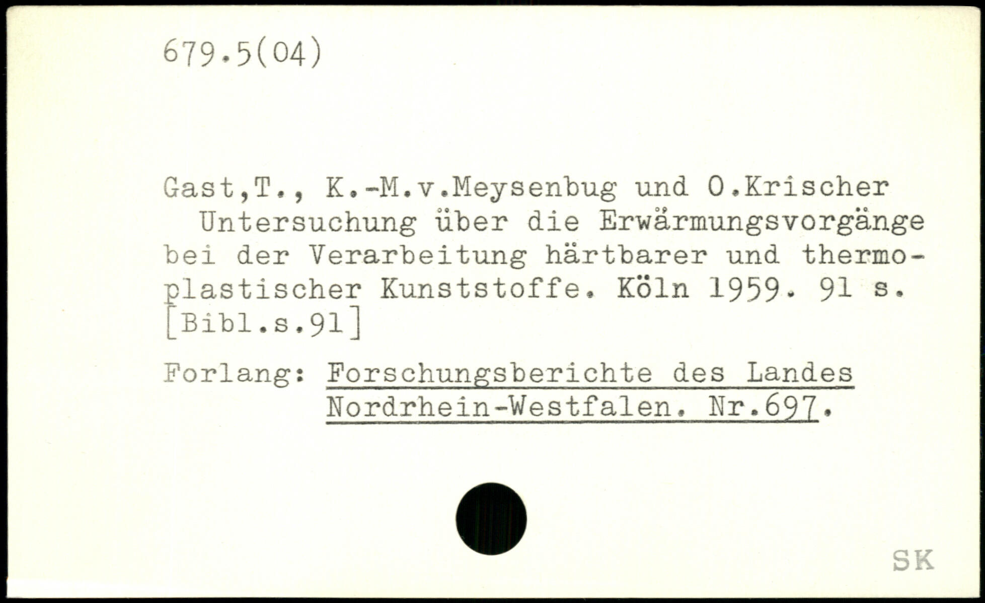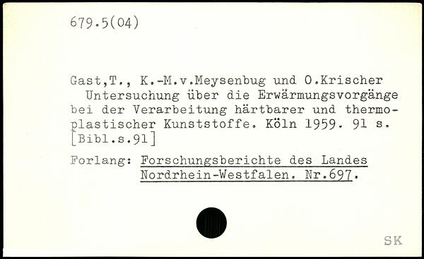 Gast,T., K.-M.v.Meysenbug und O.Krischer Untersuchung über die ErwärmungsVorgänge bei der Verarbeitung härtbarer und thermoplastischer Kunststoffe