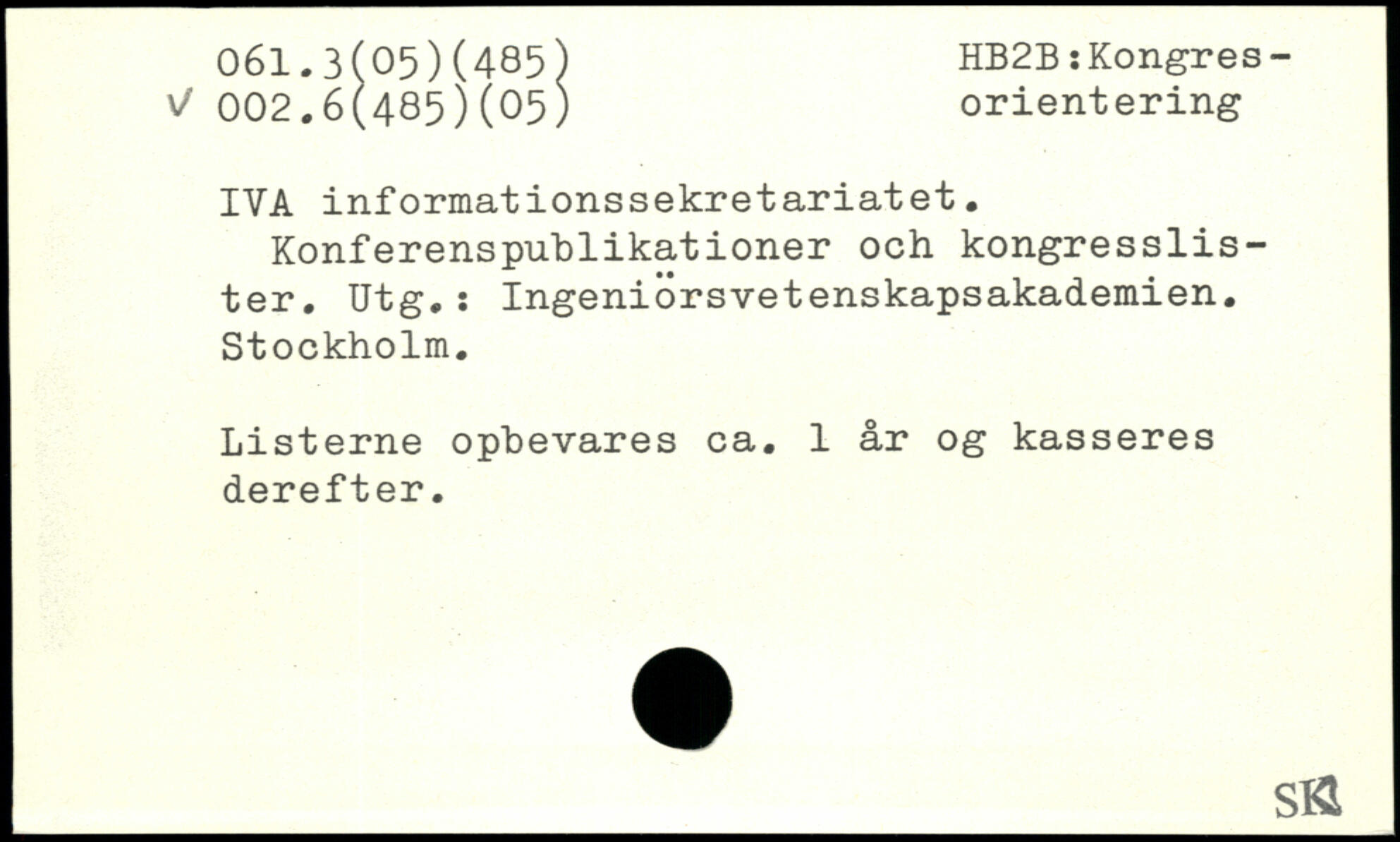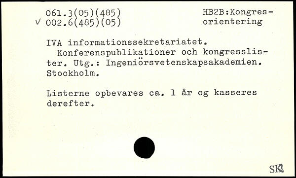 IVA informationssekretariatet. Konferenspublikationer och kongresslister. Utg.; Ingeniörsvetenskapsakademien. Stockholm. Listerne opbevares ca. 1 år og kasseres derefter. _sa