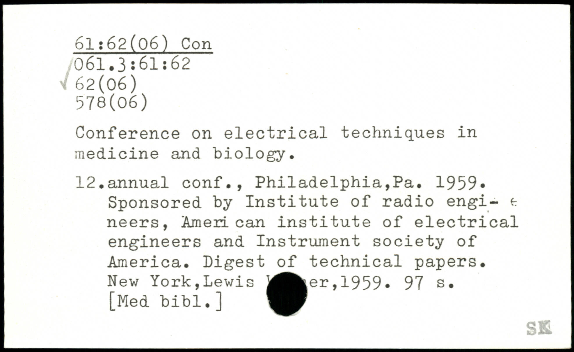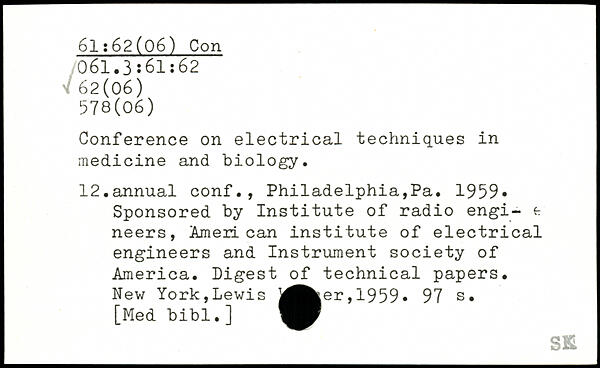 Conference on electrical techniques in medicine and biology. 12.annual conf., Philadelphia,Pa. 1959, Sponsored by Institute of radio engi- e neers, American institute of electrical engineers and Instrument society of America. Digest of technical papers. New York,Lewis j^Ä|er,1959