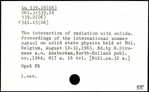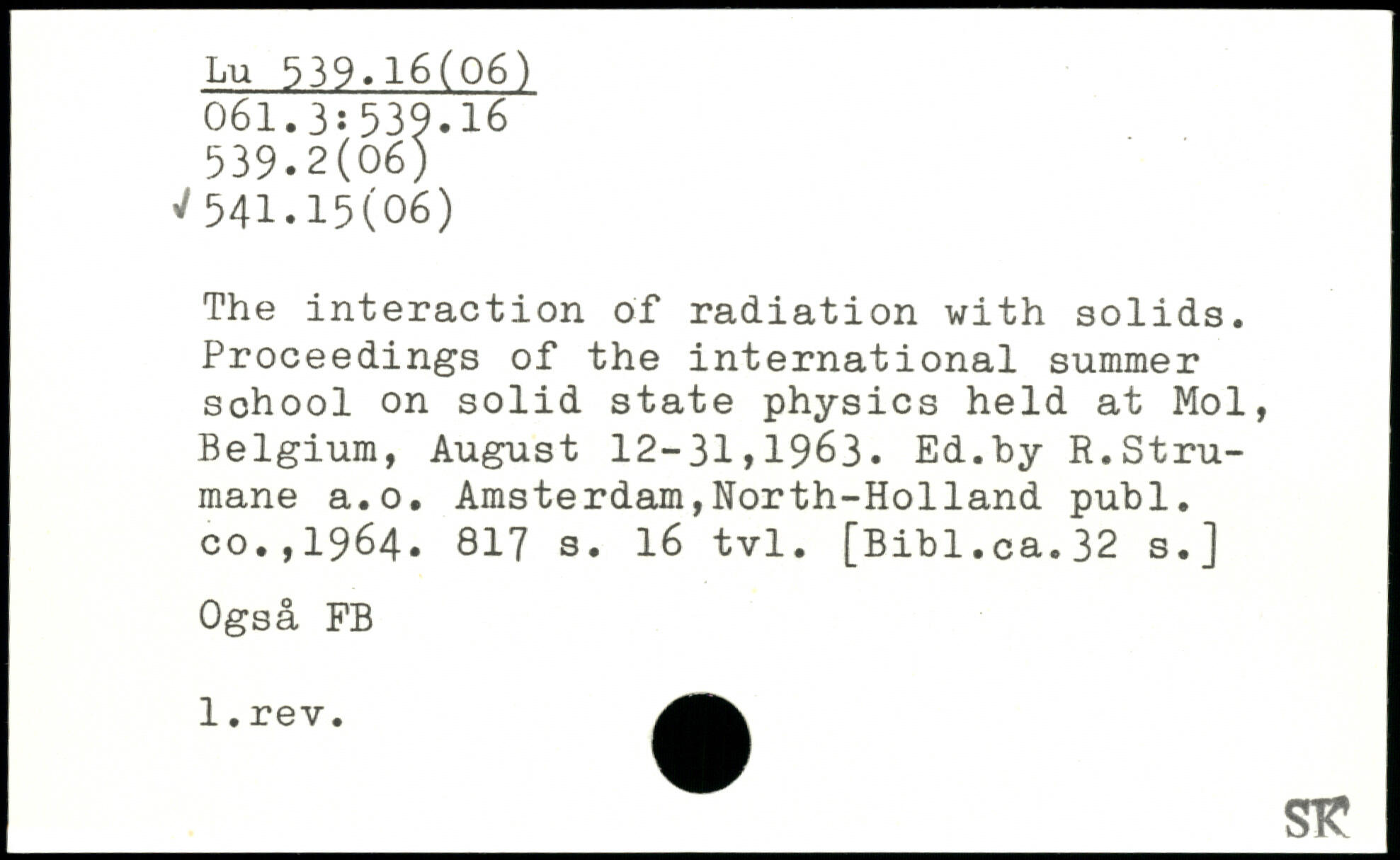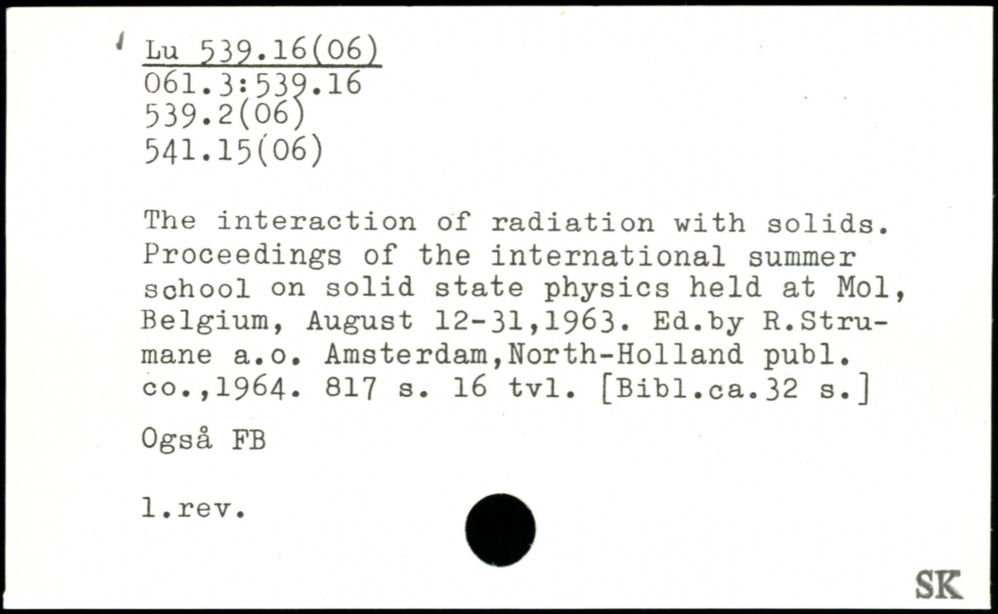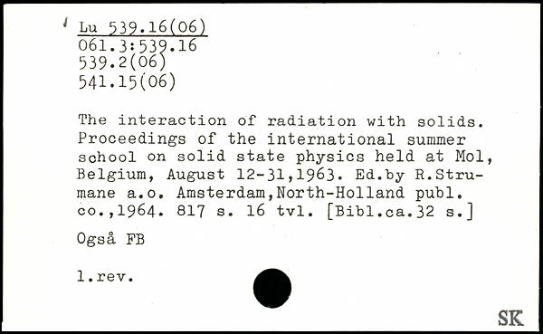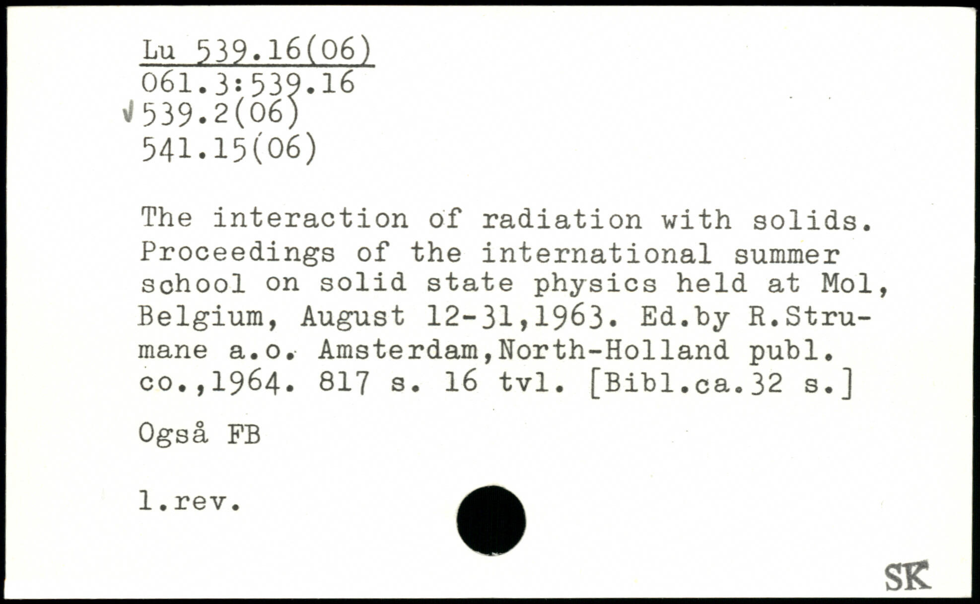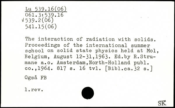 The interaction of radiation with solids. Proceedings of the international summer school on solid state physics held at Mol, Belgium, August 12-31,1963. Ed.by R.Stru-mane a.o. Amsterdam,North-Holland publ. co.,1964.