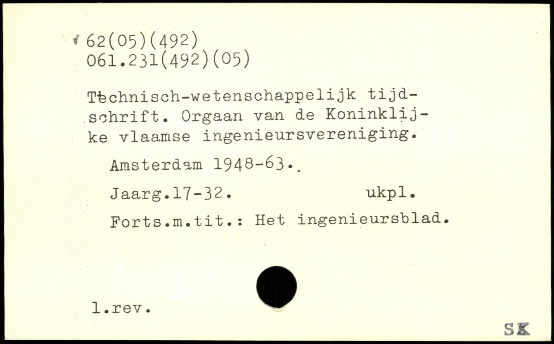 Ttechnisch-wetenschappelijk tijd-schrift. Orgaan van de Koninklij-ke vlaamse ingenieursvereniging. Amsterdam 1948-63.. Jaarg.17-32. ukpl. Forts.m.tit. : Het ingenieurslDlad.