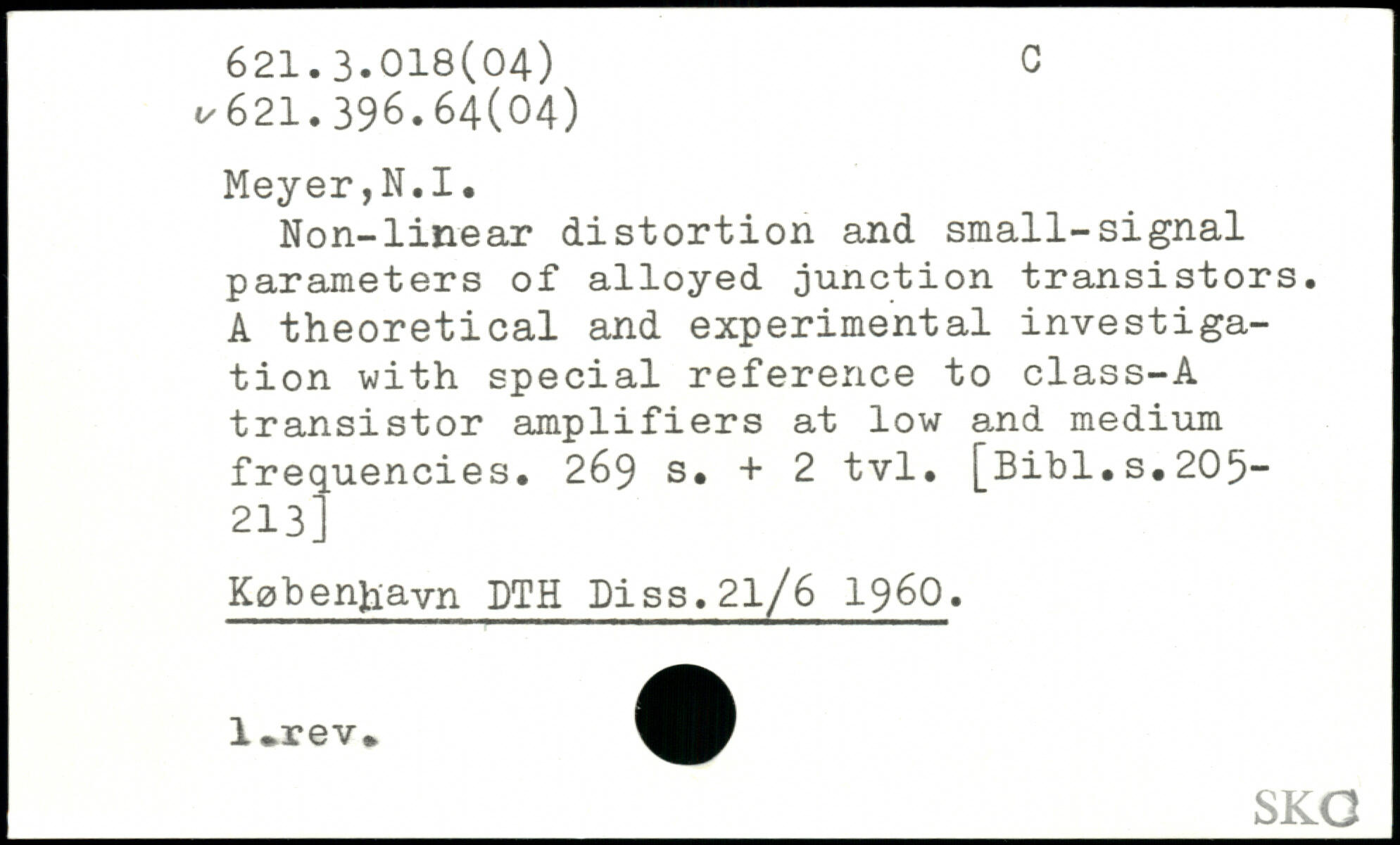 Non-linear distortion and small-signal parameters of alloyed junction transistors. A theoretical and experimental investigation with special reference to class-A transistor amplifiers at low and medium frequencies.