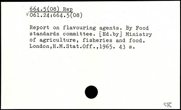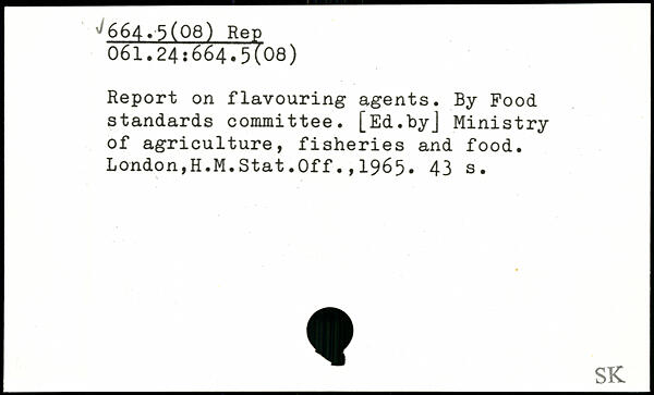 Report on flavouring agents. By Food standards committee. [Ed.by] Ministry of agriculture, fisheries and food. London,H.M.Stat.Off.,1965.