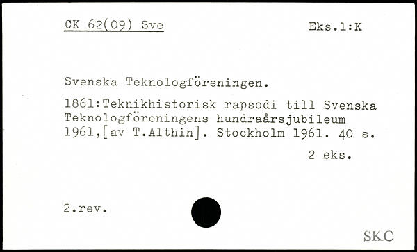 Svenska Teknologföreningen. 1861:Teknikhistorisk rapsodi till Svenska Teknologföreningens hundraårsjubileum 1961,[av T.Althin].