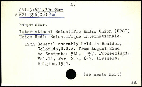 International Scientific Radio Union (URSl) Union Radio Scientifique Internationale. 12th General assembly held in Boulder, Colorado,U.S.A. from August 22nd to September 1957. Proceedings,