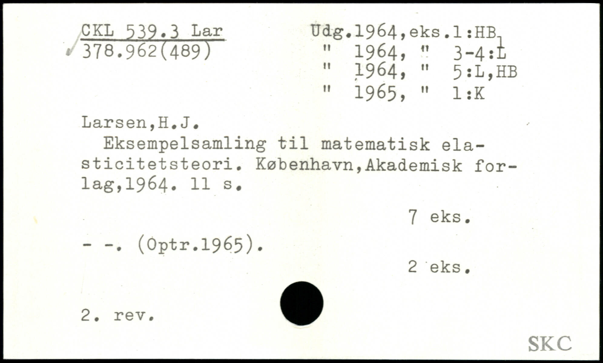 " 1964, " 5:L,HB " 1965, " IsK Larsen,H.J. Eksempelsamling til matematisk ela-sticitetsteori.