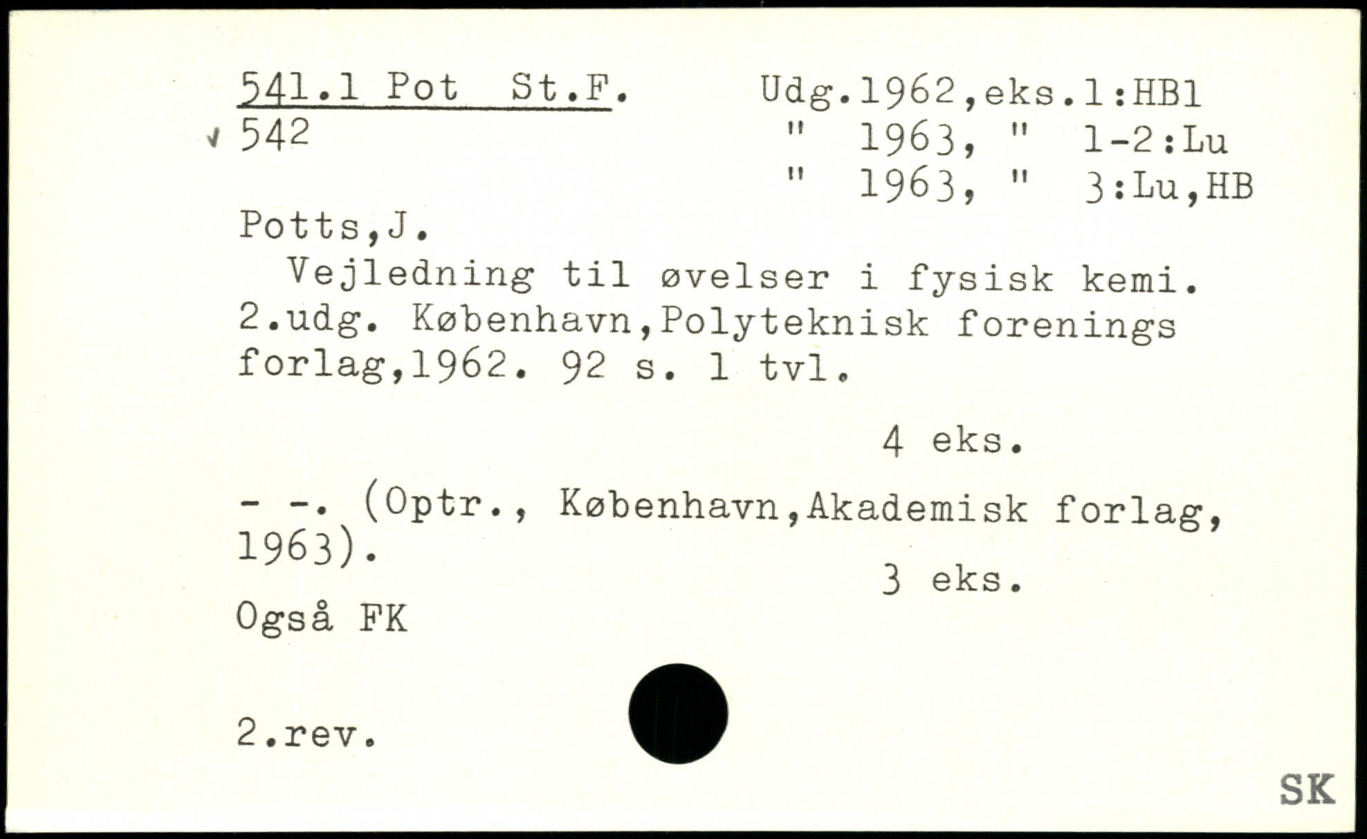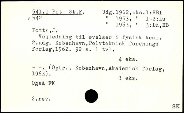 " 1963, " 3:Lu,HB Potts,J. Vejledning til øvelser i fysisk kemi.