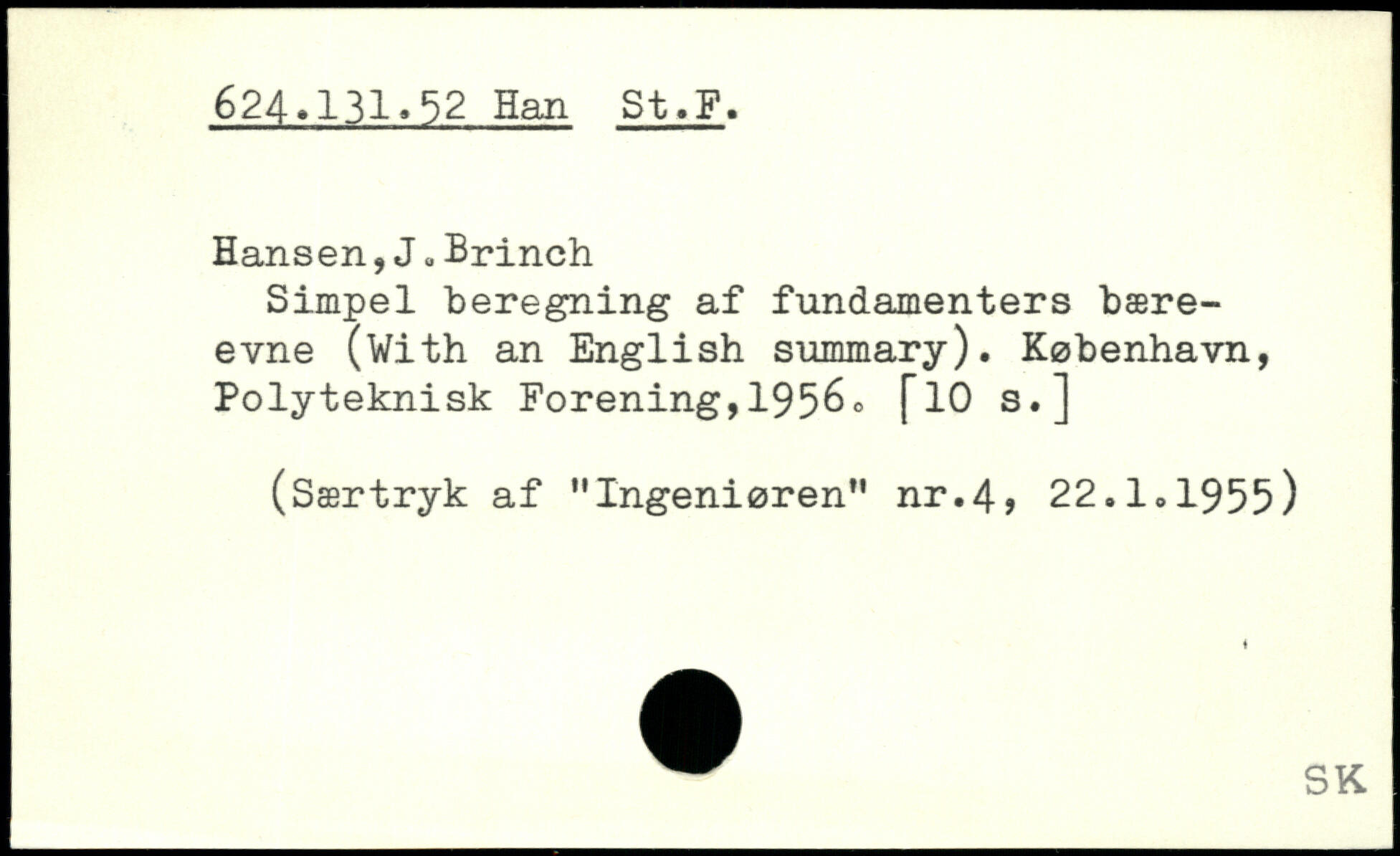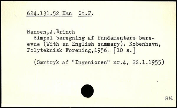 Hansen,J.Brinch Simpel beregning af fundamenters bæreevne (With an English summary). København, Polyteknisk Forening, 195^<> [~
