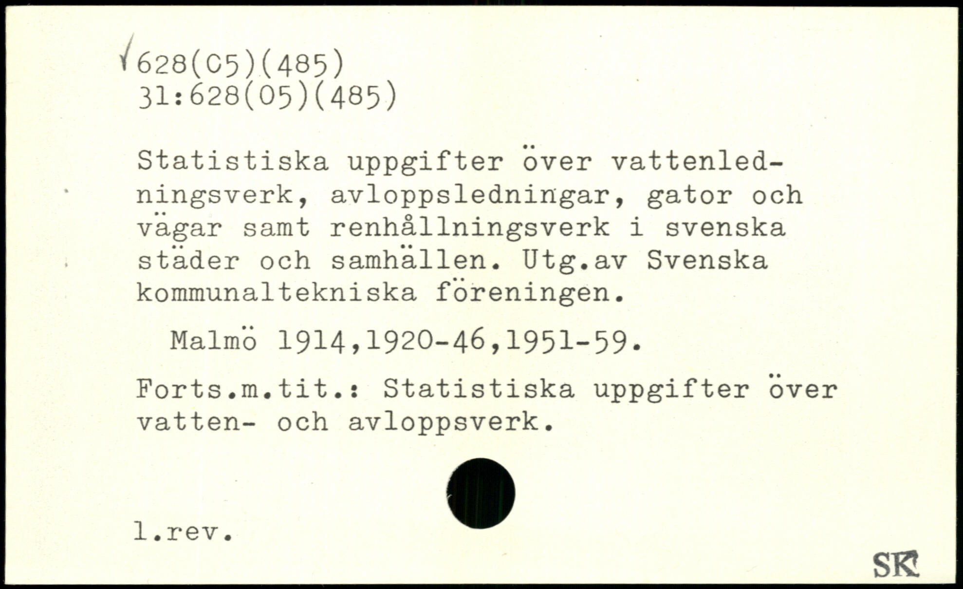 Statistiska uppgifter over vattenledningsverk, avloppsledningar, gator och vagar samt renhållningsverk i svenska stader och samhallen. Utg.av Svenska kommunaltekniska föreningen. Malmö 1914,1920-46,1951-59. Forts.m.tit.: Statistiska uppgifter över vatten- och avloppsverk. l.rev.