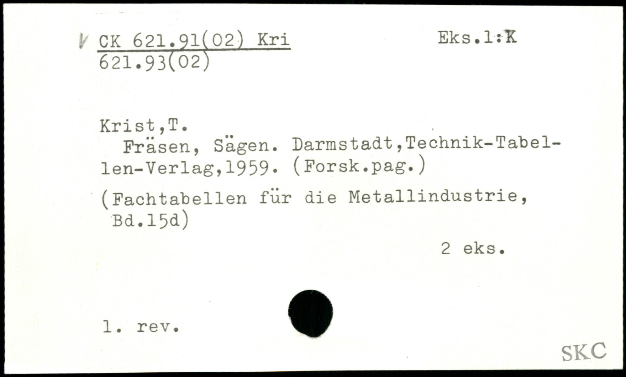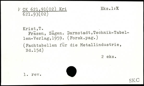 Fräsen, Sagen. Darmstadt, Technik-Tabel-1en-Verlag,1959. (Forsk.pag.) (Fachtabellen für die Metallindustrie, Bd.l5d)