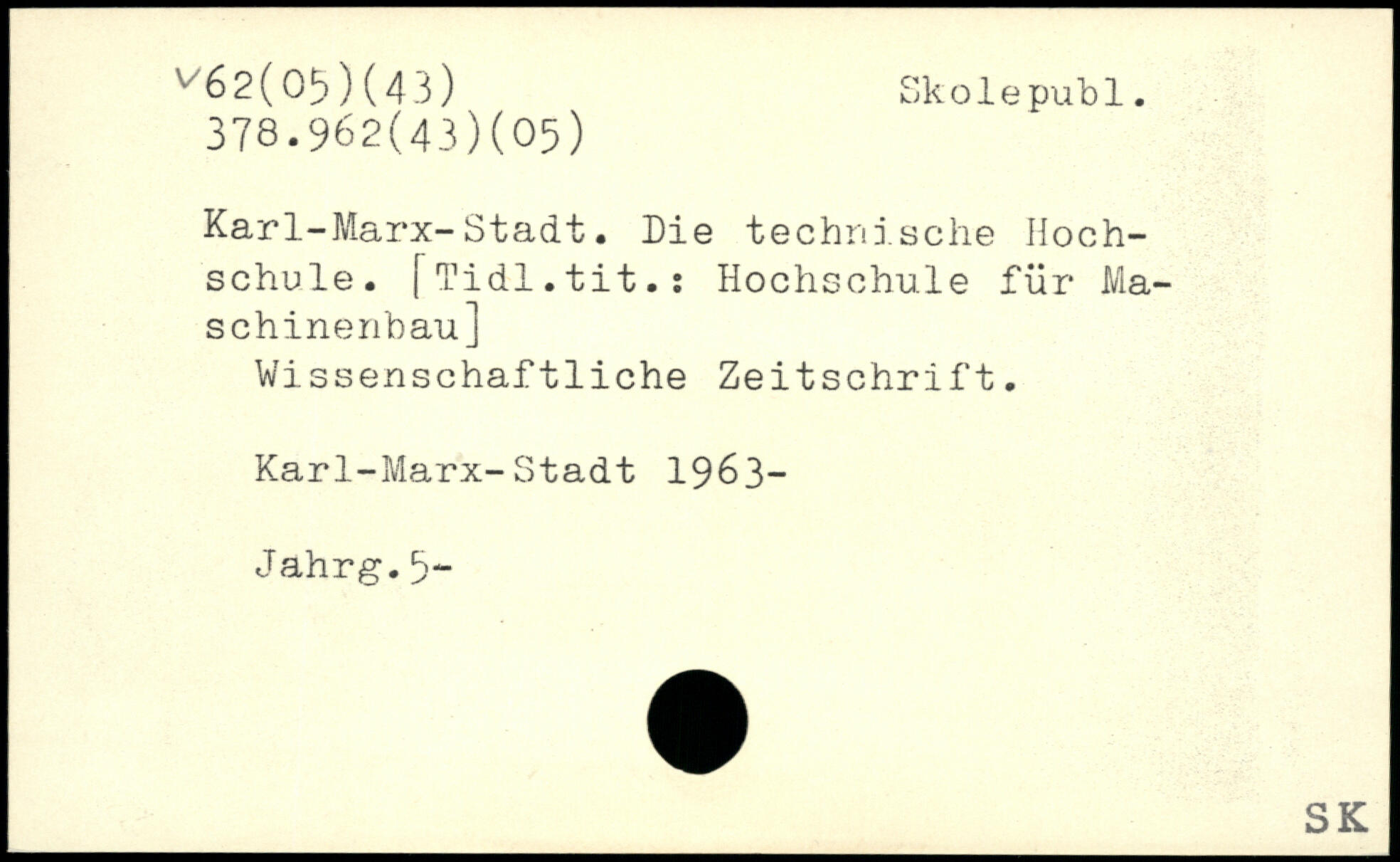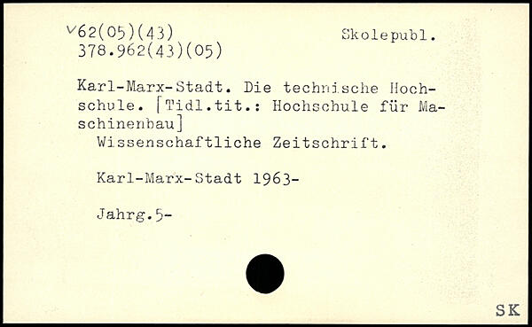 Karl-Marx-Stadt. Die technische Hochschule. [Tidl.tit.: Hochschule für Maschinenbau] Wissenschaftliche Zeitschrift. Karl-Marx-Stadt 1963-Jahrg.5-