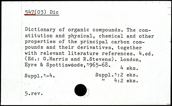 Dictionary of organic compounds. The constitution and physical, chemical and other properties of the principal carbon compounds and their derivatives, together with relevant literature references.