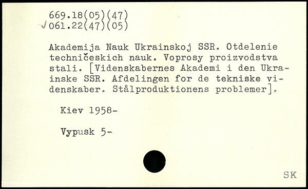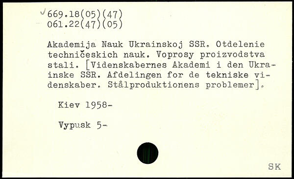 Akademija Nauk Ukrainskoj SSR, Otdelenie techniceskich nauk. Voprosy proizvodstva stali. [Videnskabernes Akademi i den Ukrainske SSR. Afdelingen for de tekniske videnskaber. Stålproduktionens problemer], Kiev 1958- Vypusk 5-