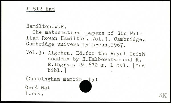 The mathematical papers of Sir V1111am Rowan Hamilton.