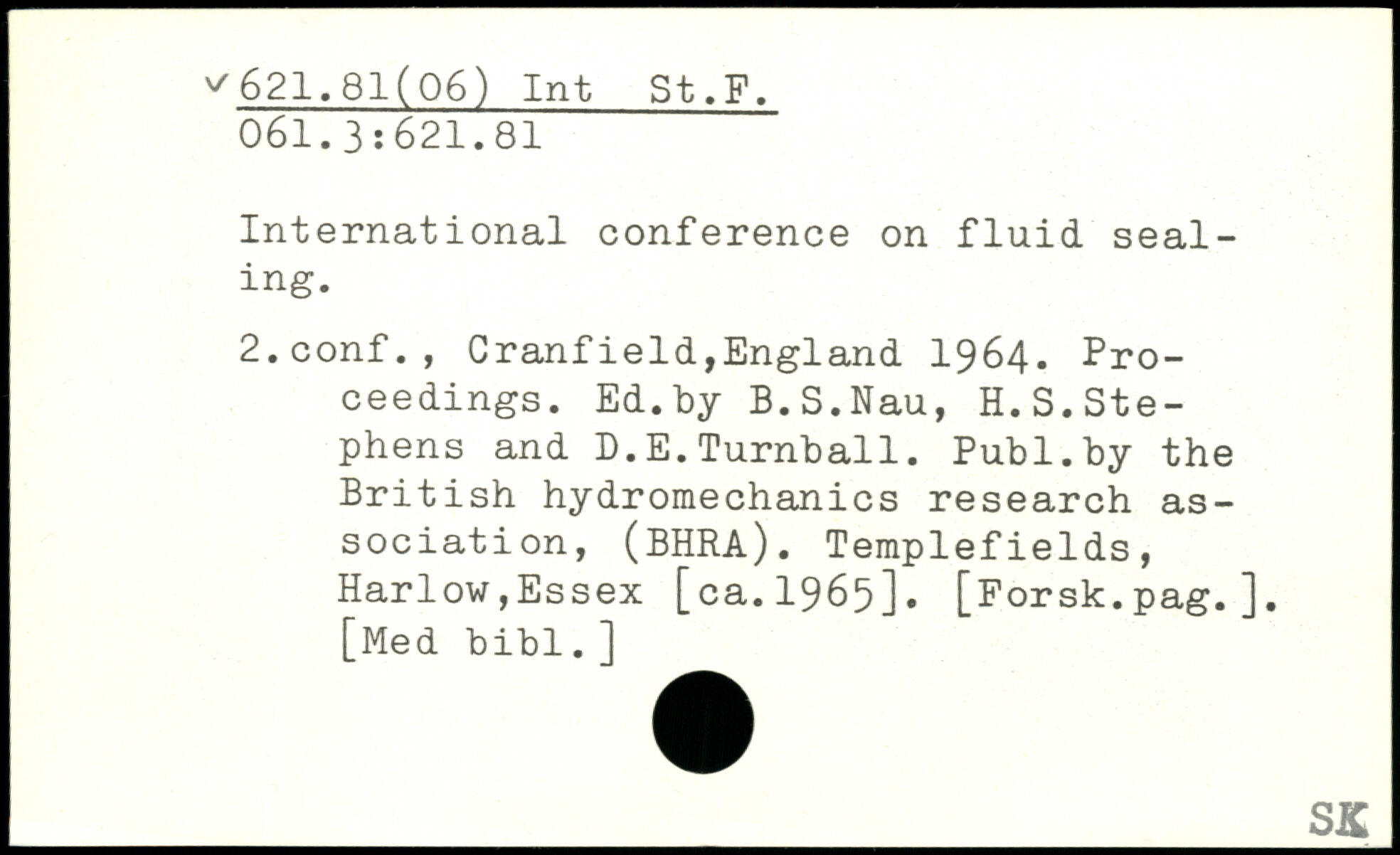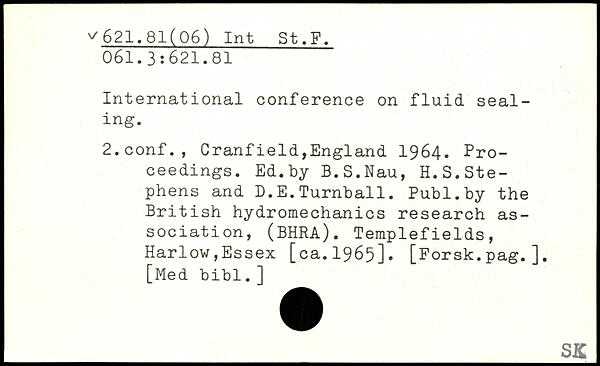 International conference on fluid sealing. 2.conf., Cranfield,England 1964. Proceedings. Ed.by B.S.Nau, H.S.Stephens and D.E.Turnball.