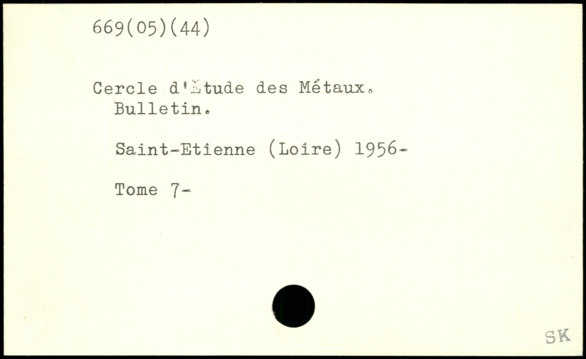 Cercle d'étude des Métaux. Bulletin. Saint-Etienne (Loire) 1956-Tome 7~