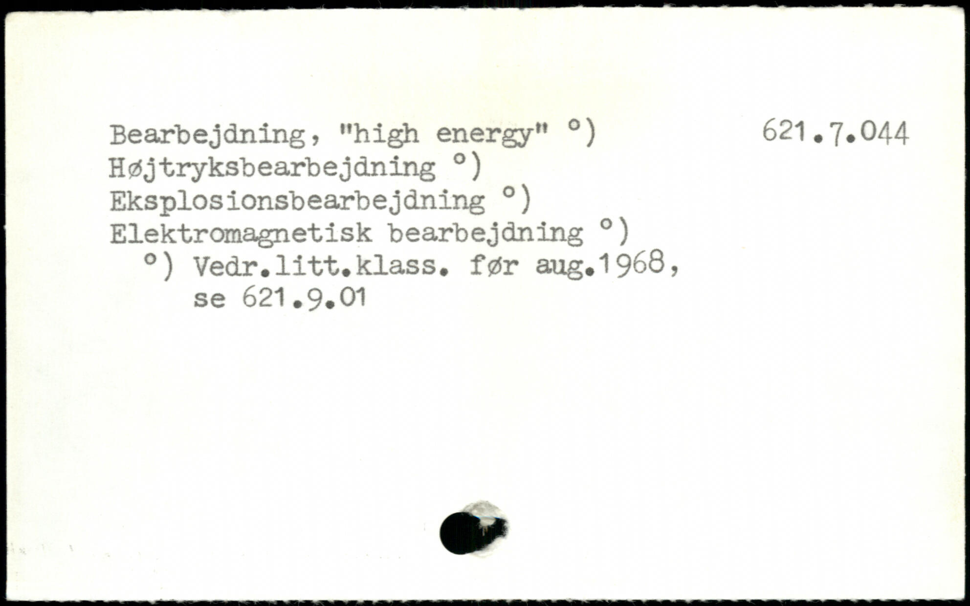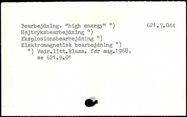 Bearbejdning, "high energy" .) 621.7.044 Højtryksbearbejdning .) Eksplosionsbearbejdning .) Elektromagnetisk bearbejdning .) .) Vedr.litt.klass. før aug.1968, se 621.9.01