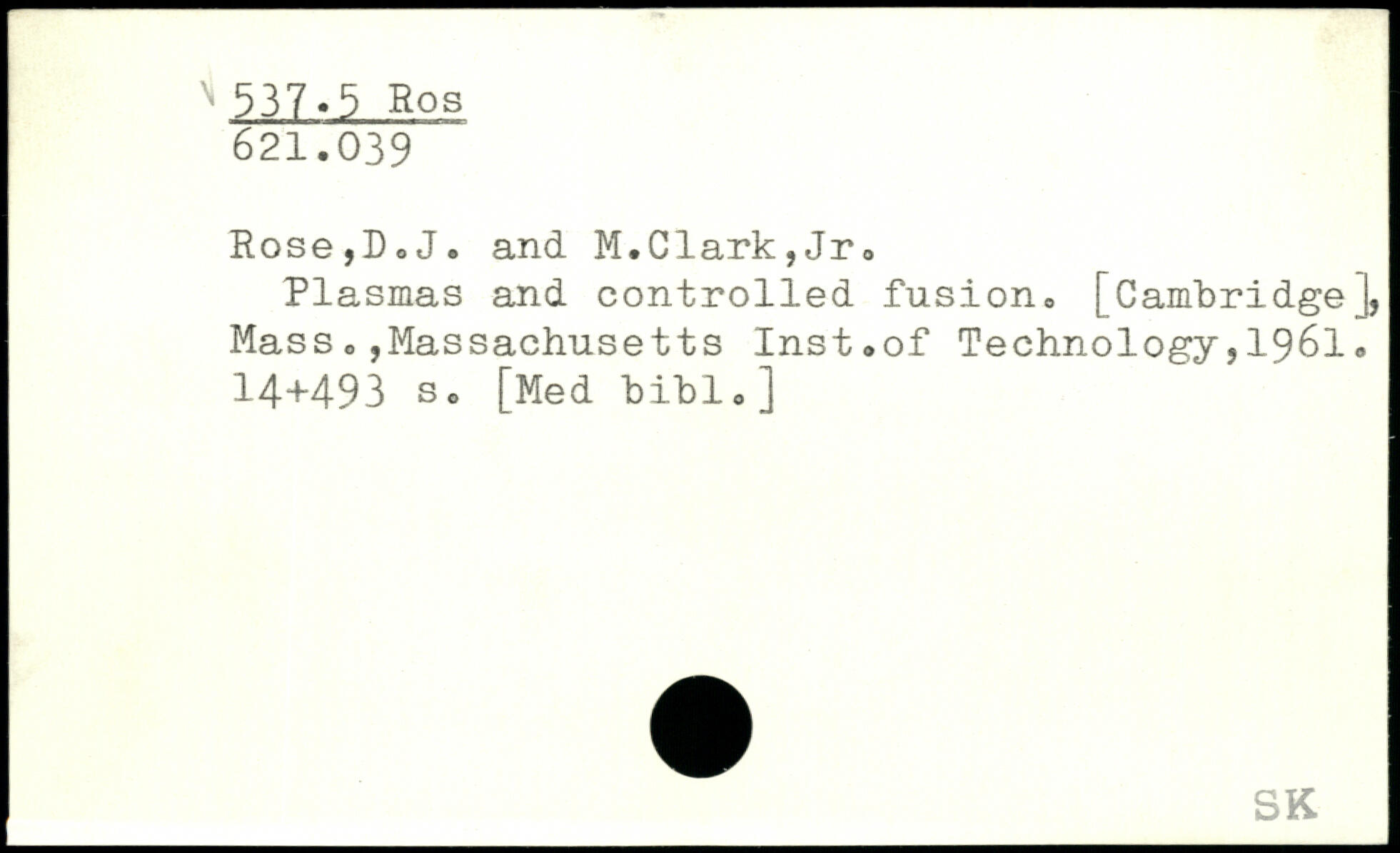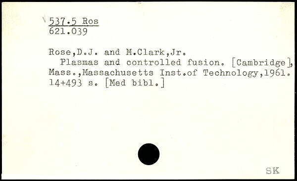Rose,D.J. and M.Clark,Jr. Plasmas and controlled fusion. [Cambridge |, MassMassachusetts Inst.of Technology,1961.