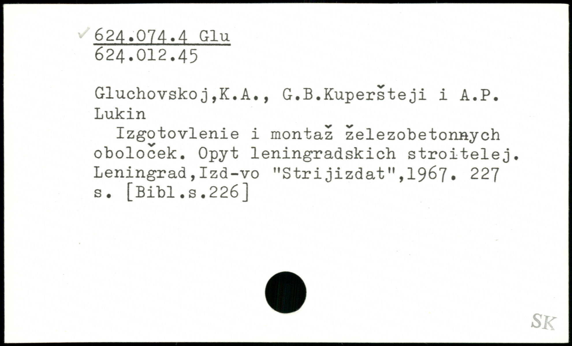 Gluchovskoj,K.A., G.B.Kupersteji i A.P. Lukin Izgotovlenie i montaz zelezobetormych obolocek. Opyt leningradskich stroitelej. Leningrad,Izd-vo "Strijizdat",1967.