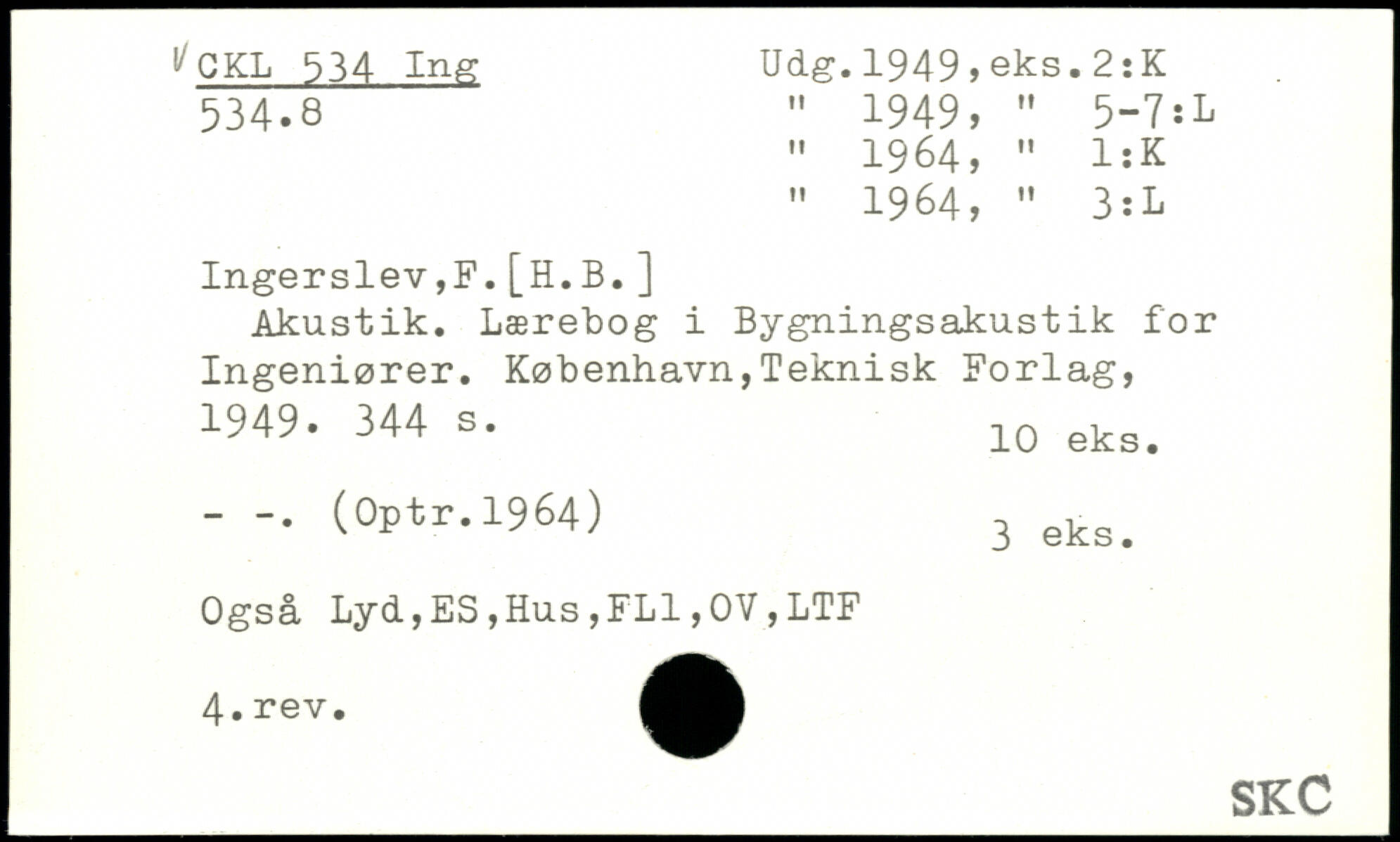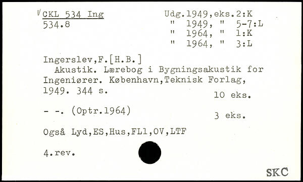 " 1964, " 1:K " 1964, " 3:L Ingerslev,F.[H.B.] Akustik. Lærebog i Bygningsakustik for Ingeniører. København,Teknisk Forlag, x949.