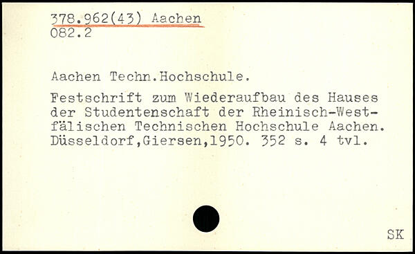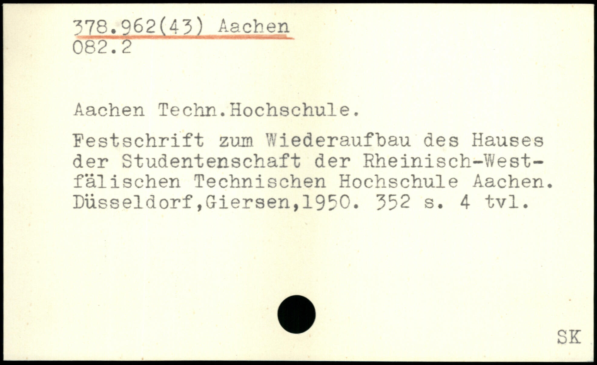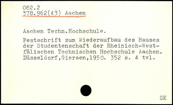Aachen Techn.Hochschule. Festschrift zum Wiederaufbau des Hauses der Studentenschaft der Rheinisch-Westfälischen Technischen Hochschule Aachen.