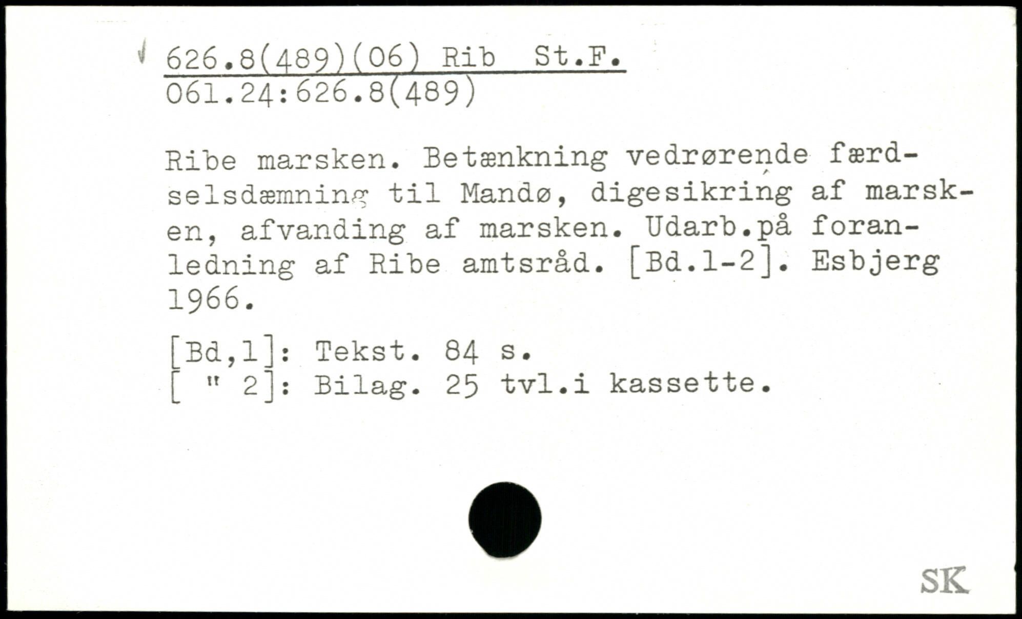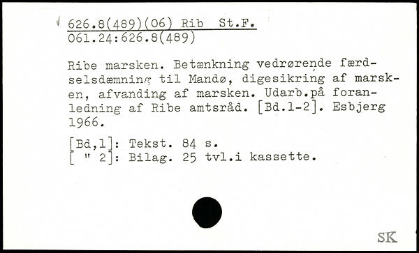 Ribe marsken. Betænkning vedrørende færdselsdæmning til Mandø, dige sikring af marsken, afvanding af marsken. Udarb.på foranledning af Ribe amtsråd. [