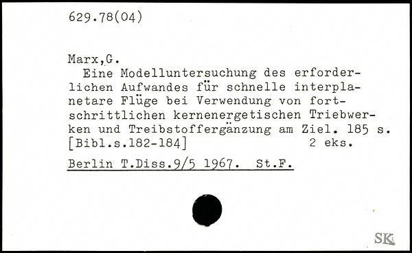 Eine Modelluntersuchung des erforderlichen Aufwandes für schnelle interplanetare Flüge bei Verwendung von fortschrittlichen kernenergetischen Triebwerken und Treibstofferganzung am Ziel.