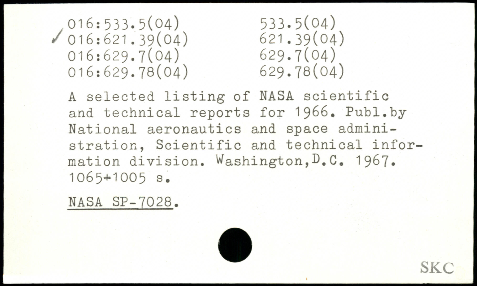 A selected listing of NASA scientific and technical reports for 1966.
