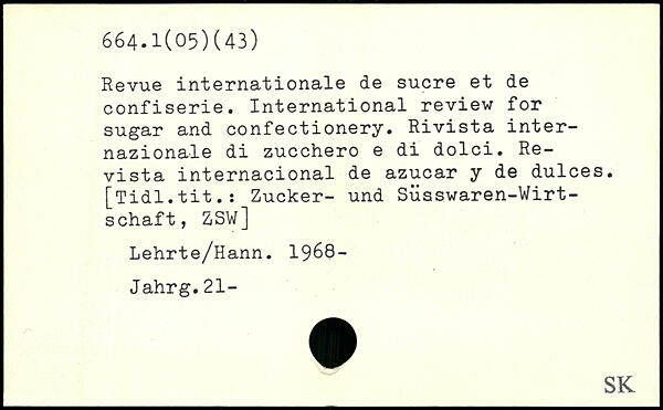 Revue Internationale de sucre et de confiserie. International review for sugar and confectionery. Rivista inter-nazionale di zucchero e di dolci. Revista internacional de azucar y de dulces. [Tidl.tit.i Zucker- und Susswaren-Wirt-schaft, ZSW] Lehrte/Hann. 1968- Jahrg.21-