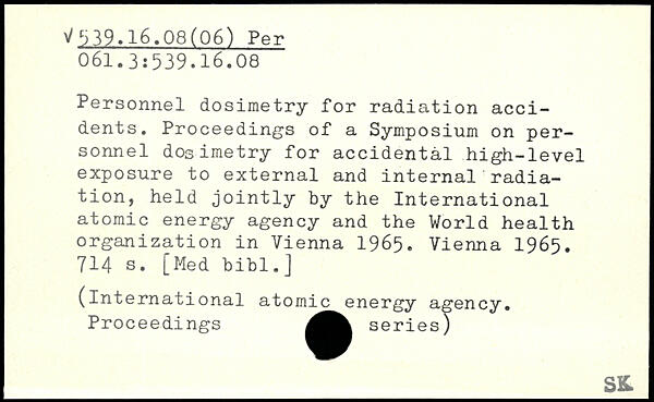 Personnel dosimetry for radiation accidents. Proceedings of a Symposium on personnel dosimetry for accidental high-level exposure to external and internal radiation, held jointly by the International atomic energy agency and the World health organization in Vienna 1965. Vienna 1965.