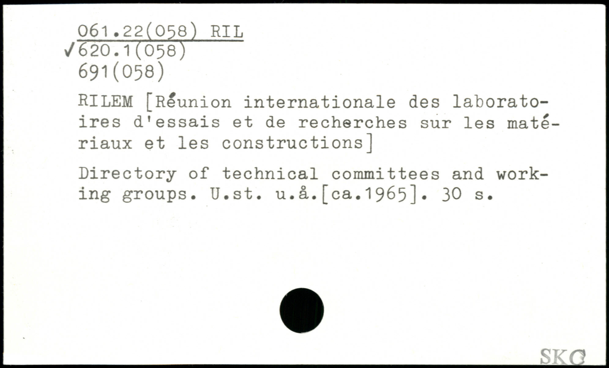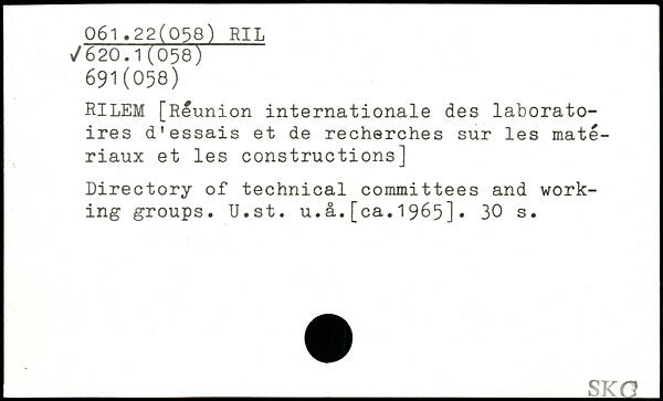RILEM [Reunion internationale des laboratoires d'essais et de recherches sur les matériaux et les constructions] Directory of technical committees and working groups. U.st. u.â.[ca.1965].