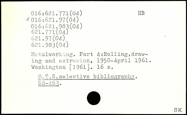 Metalworking. Part 4 tolling,drawing and extrusion, 1950-April 1961.
