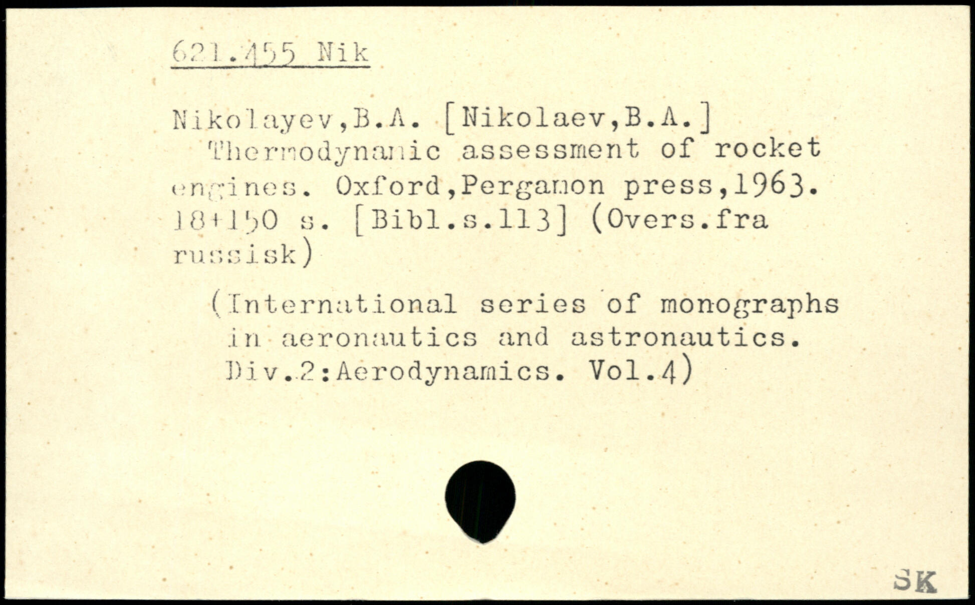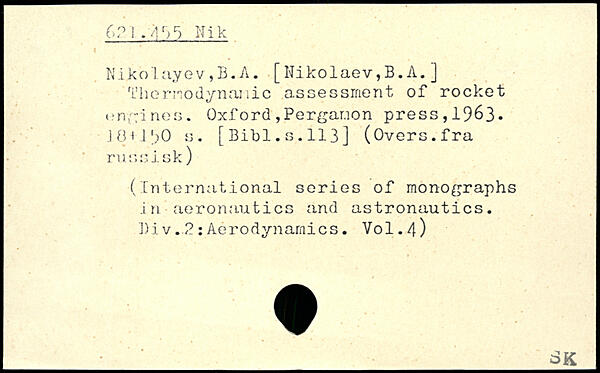 Nikolayev,B.A. [ Nikolaev,B. A. ] Thermodynamic assessment of rocket engines. Oxford, Pergar.ion press, 1963. HMi';0 a. [ Bibl. s. 113 ] (Overs, fra russisk) (International series of monographs .in aeronautics and astronautics. Niv.2:Aerodynamics. V0I.4)